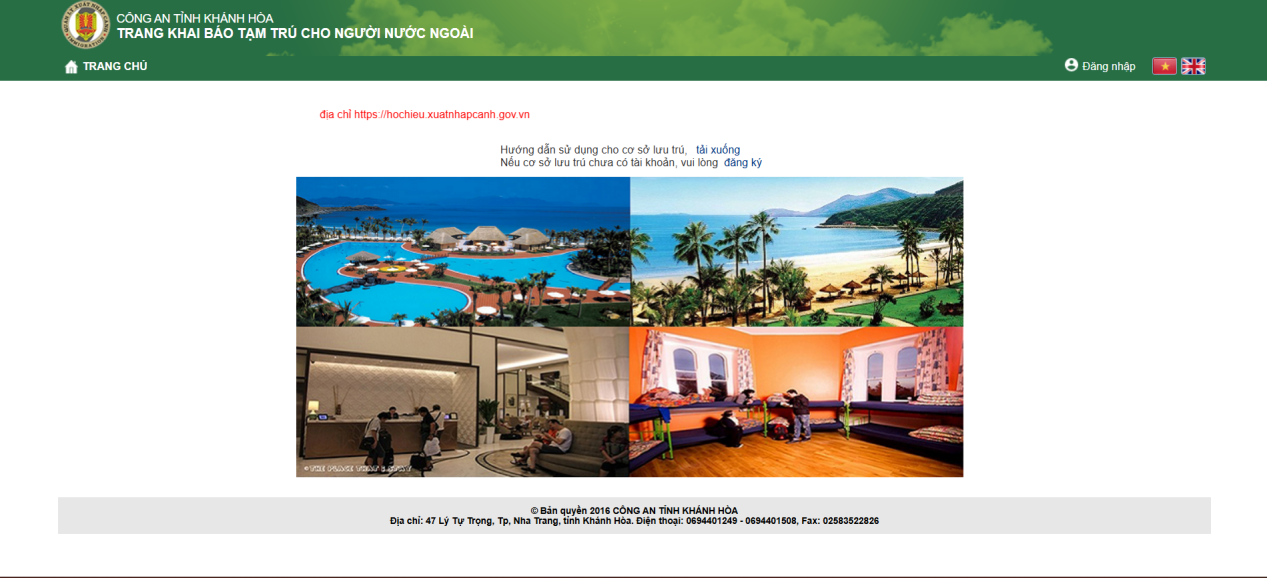 Bước 1: Người khai báo tạm trú đăng ký tài khoản khai báo tạm trú tại Trang thông tin điện tử về khai báo tạm trú của Cơ quan Quản lý xuất nhập cảnh Công an cấp tỉnh/thành nơi đặt cơ sở lưu trú. Tại Khánh Hòa, khai báo trực tuyến tại Trang thông tin điện tử địa chỉ: (https://khanhhoa.xuatnhapcanh.gov.vn).