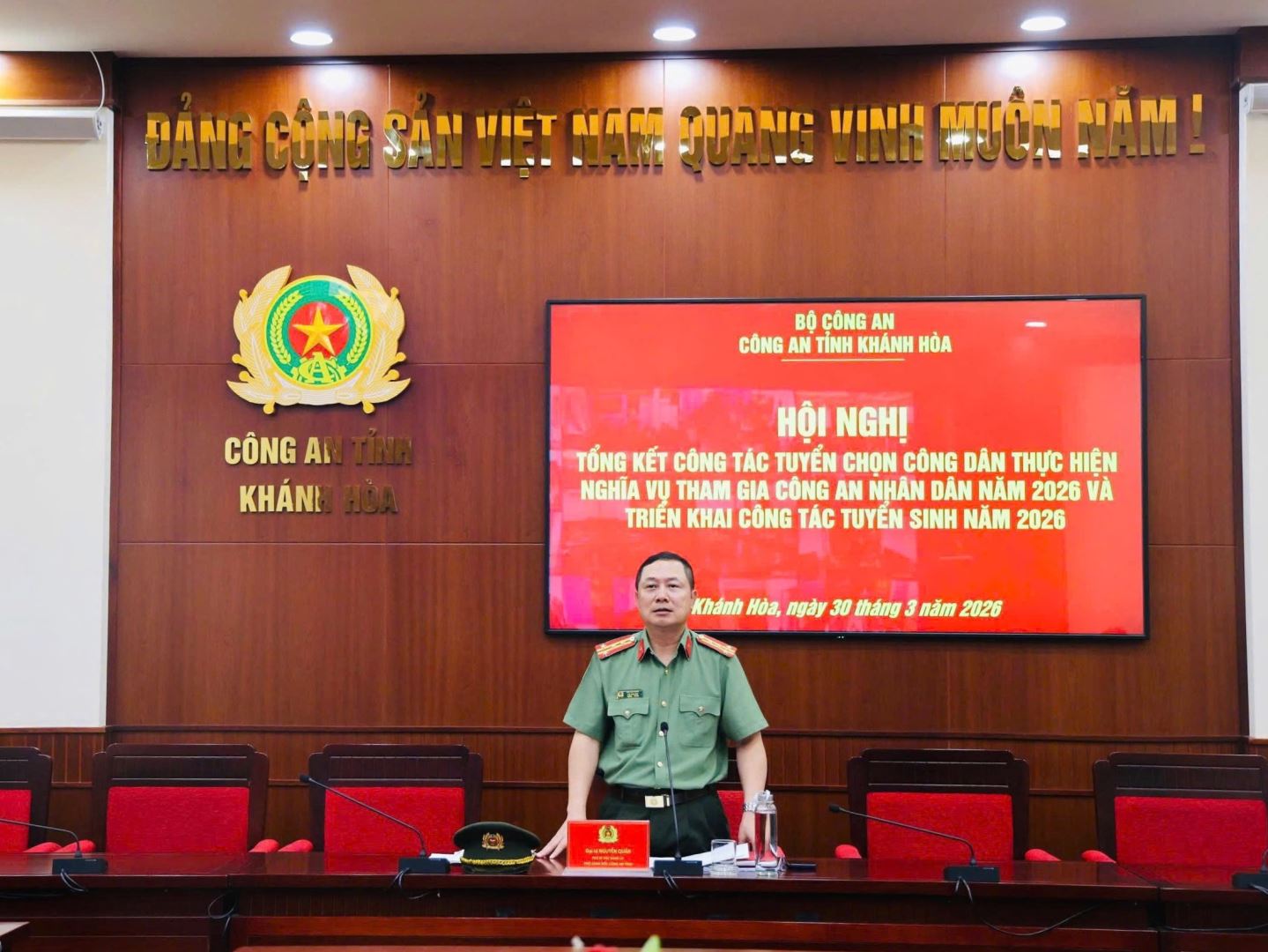 Sáng ngày 30/3/2026, Công an tỉnh Khánh Hòa tổ chức Hội nghị tổng kết công tác tuyển chọn công dân thực hiện nghĩa vụ tham gia Công an nhân dân năm 2026 và triển khai phương hướng công tác tuyển sinh năm 2026. Tham dự hội nghị có đồng chí Đại tá Nguyễn Quân, Phó Bí thư Đảng ủy, Phó Giám đốc Công an tỉnh chủ trì hội nghị. Hội nghị được tổ chức kết nối trực tuyến từ điểm cầu trung tâm tại Công an tỉnh đến các điểm cầu tại Cơ sở 2 và Công an các xã, phường trên địa bàn toàn tỉnh.