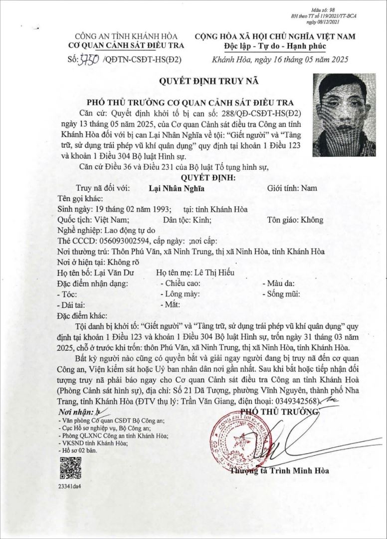 Phòng Cảnh sát hình sự – Công an tỉnh Khánh Hòa thông báo về đối tượng truy nã: Theo Quyết định truy nã số 5750 ngày 16/05/2025, hiện đang truy nã đặc biệt nguy hiểm trên phạm vi toàn quốc đối với đối tượng: