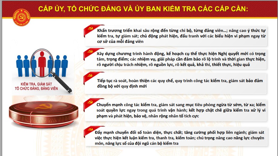 Cùng với đó, ban hành các văn bản theo thẩm quyền để các tổ chức đảng thực hiện nhiệm vụ kiểm tra, giám sát và kỷ luật của Đảng và Mặt trận Tổ quốc, các tổ chức chính trị - xã hội, Nhân dân tham gia giám sát, phản biện; đề xuất với cấp có thẩm quyền về những vấn đề cần bổ sung, sửa đổi văn bản về công tác kiểm tra, giám sát của Đảng.