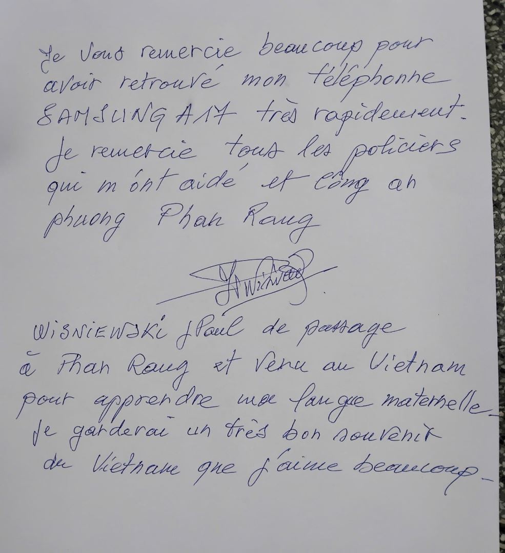 Thư cảm ơn Công an phường Phan Rang của ông Jean - Paul Wisniewski
