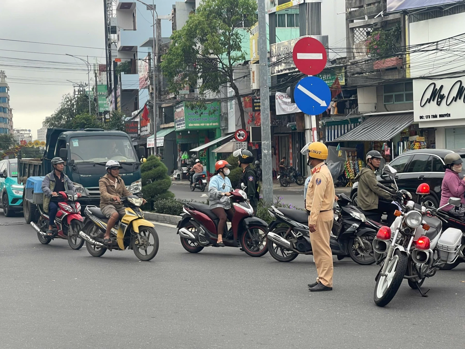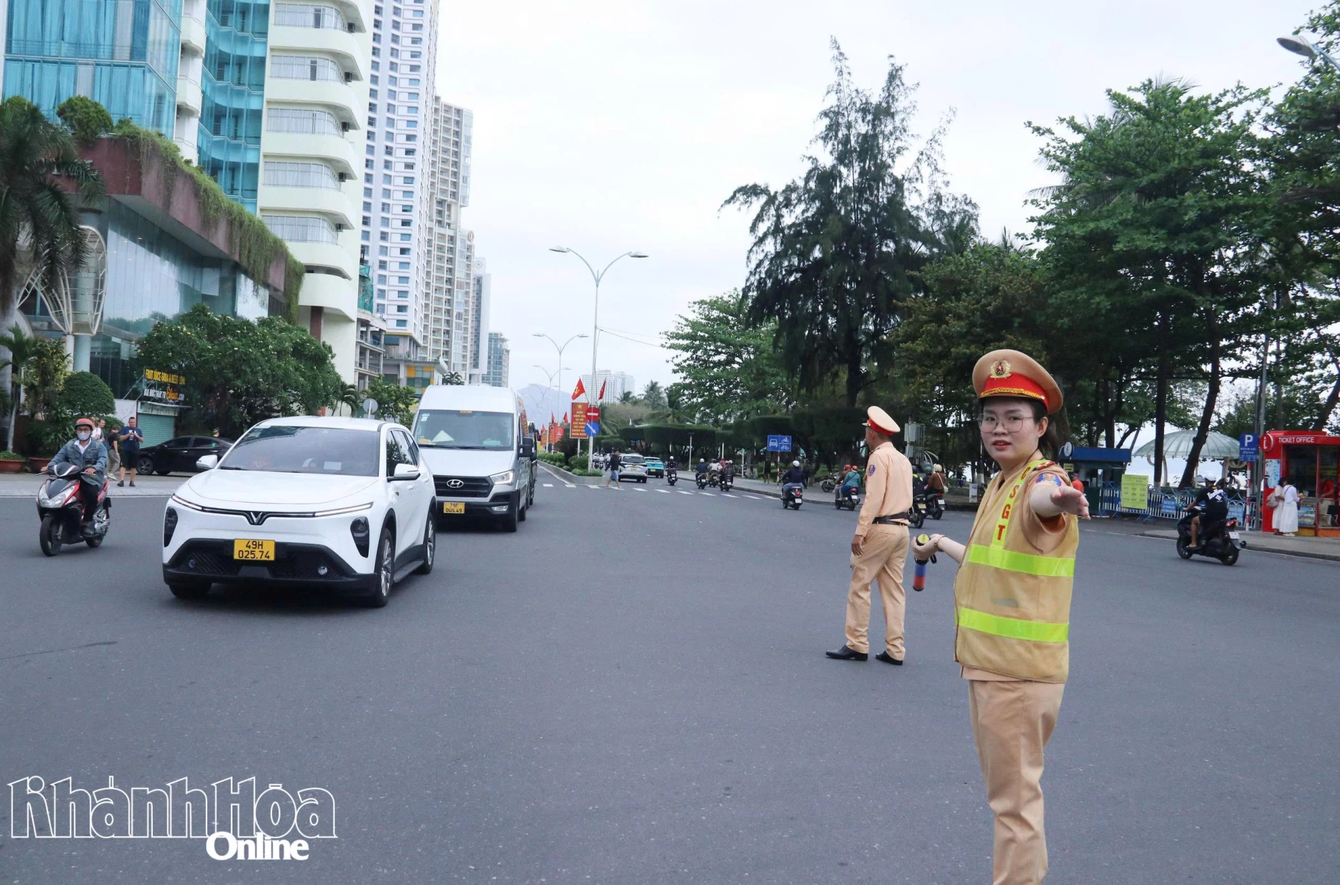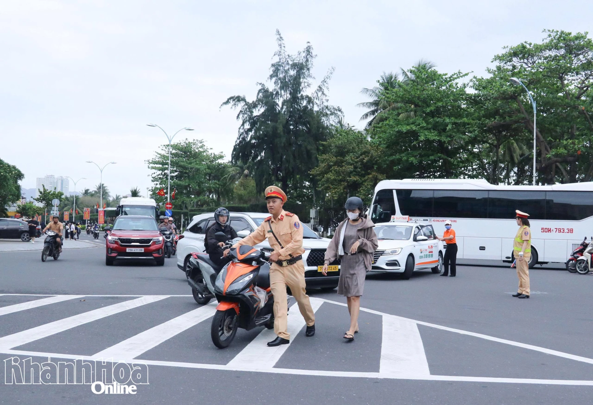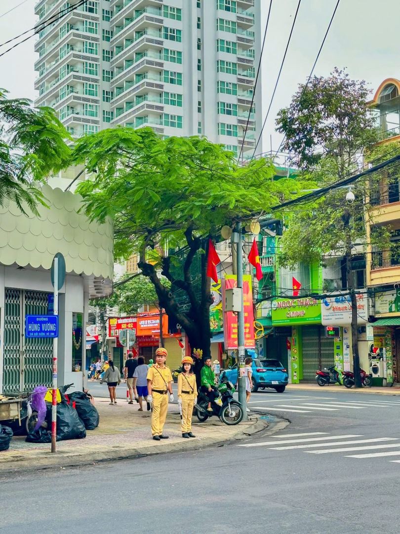 Lực lượng Cảnh sát giao thông trực phân luồng giao thông trên các tuyến đường chính trung tâm Nha Trang.