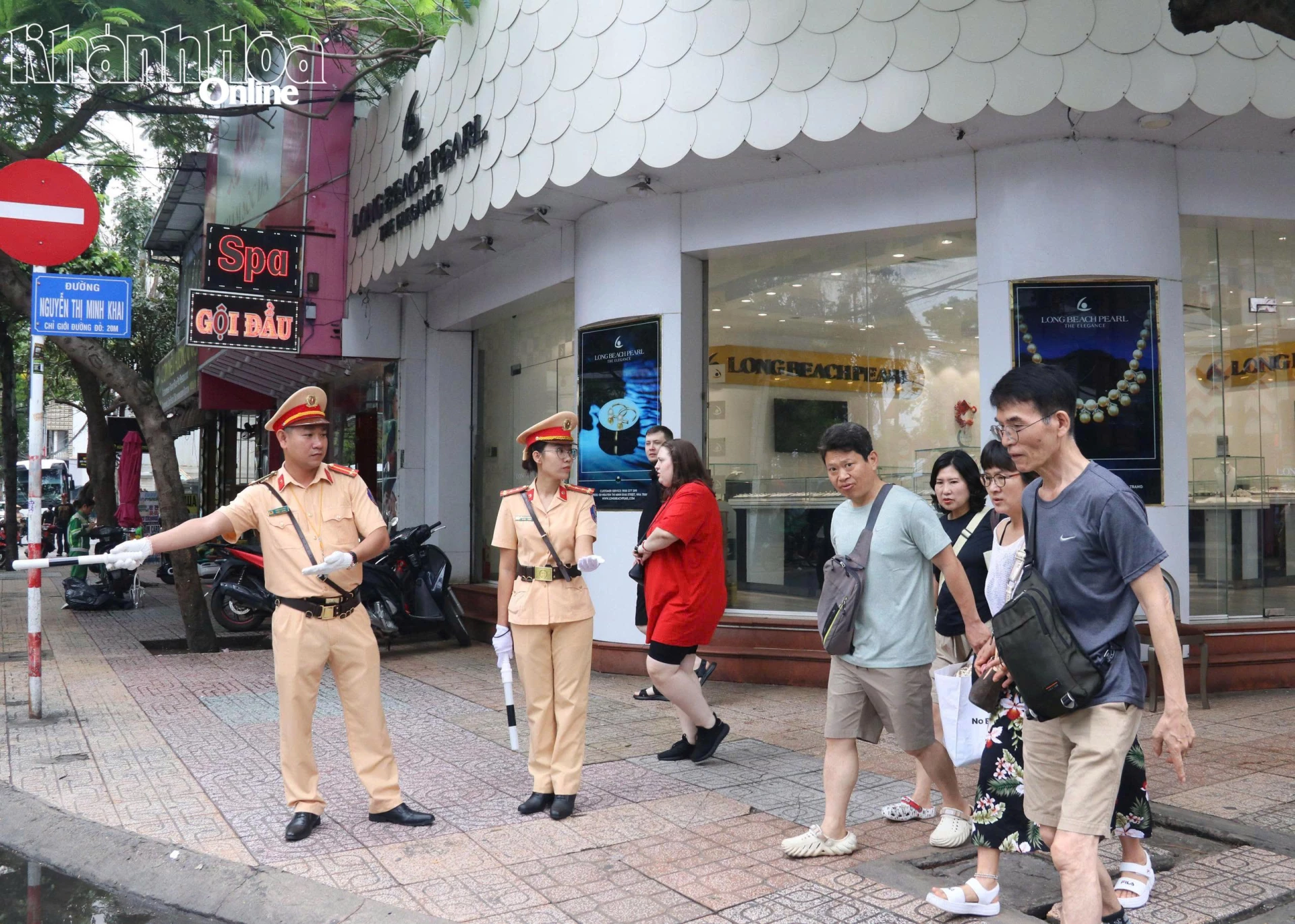 Lực lượng Cảnh sát giao thông hỗ trợ du khách nước ngoài qua đường tại ngã tư Nguyễn Thị Minh Khai - Hùng Vương (phường Nha Trang). Ảnh: CHÂU TƯỜNG