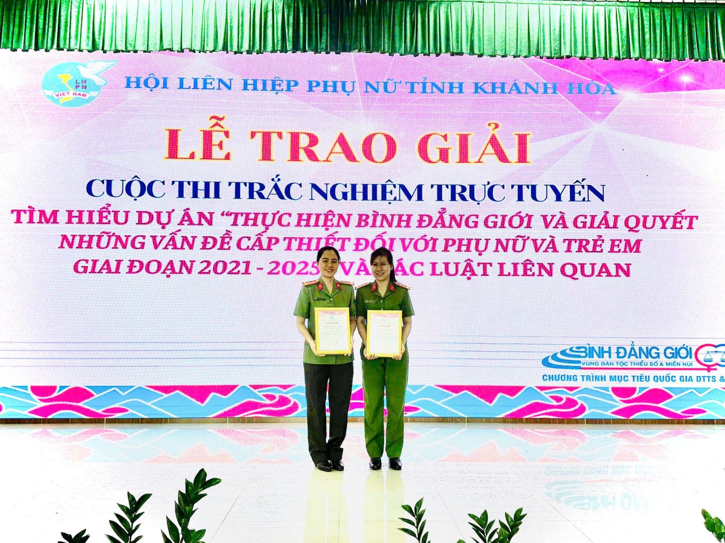 Đồng chí Nguyễn Thị Mai Hiếu – HPN Phòng Cảnh sát PCCC và CNCH, đồng chí Huỳnh Thị Thảo Nguyên – HPN Phòng Kỹ thuật nghiệp vụ đạt giải khuyến khích cuộc thi tìm hiểu Dự án “Thực hiện Bình đẳng giới và giải quyết những vấn đề cấp thiết đối với phụ nữ và trẻ em giai đoạn 2021-2025 và các Luật liên quan do Hội LHPN tỉnh Khánh Hòa tổ chức.