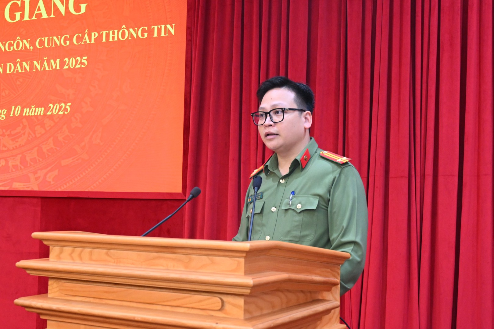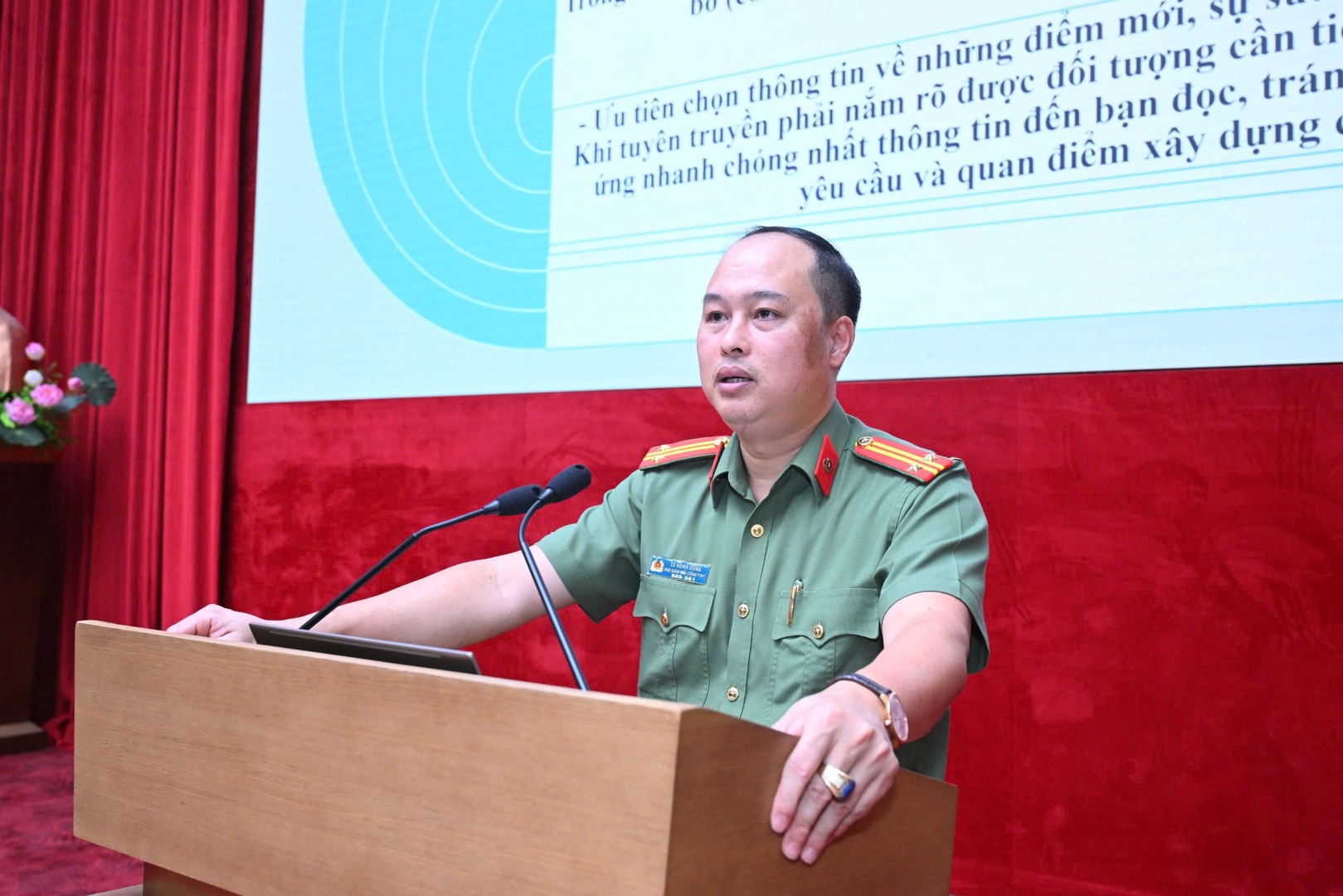 Trung tá Nguyễn Tuấn Ngọc, Phó Giám đốc Cổng Thông tin điện tử Bộ Công an trình bày những nhận thức chung về công tác phát ngôn, cung cấp thông tin của lực lượng CAND.