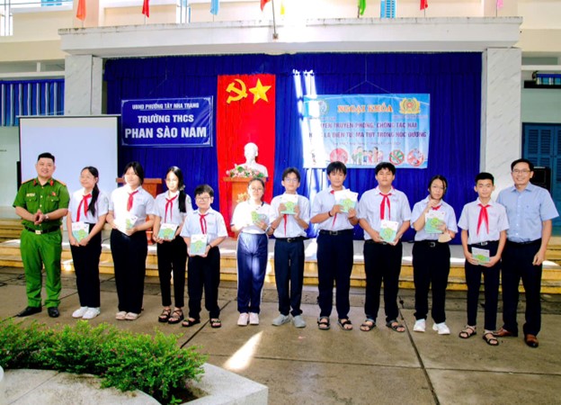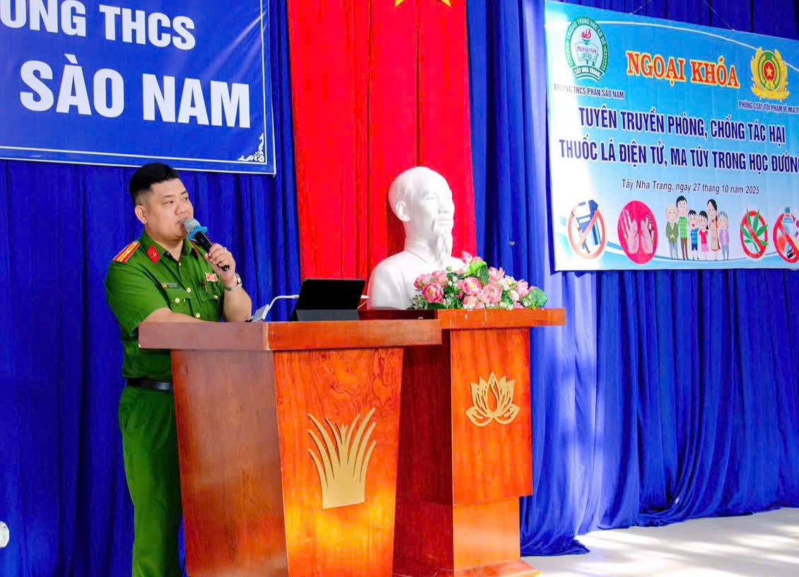 Sáng ngày 27/10/2025, Phòng CSĐTTP về Ma Tuý - Công an Tỉnh Khánh Hoà phối hợp cùng Trường THCS Phan Sào Nam tổ chức tuyên truyền phòng, chống tác hại của thuốc lá điện tử,ma tuý và tìm hiểu Luật phòng chống ma tuý cho hơn 600 học sinh và giáo viên nhà trường.