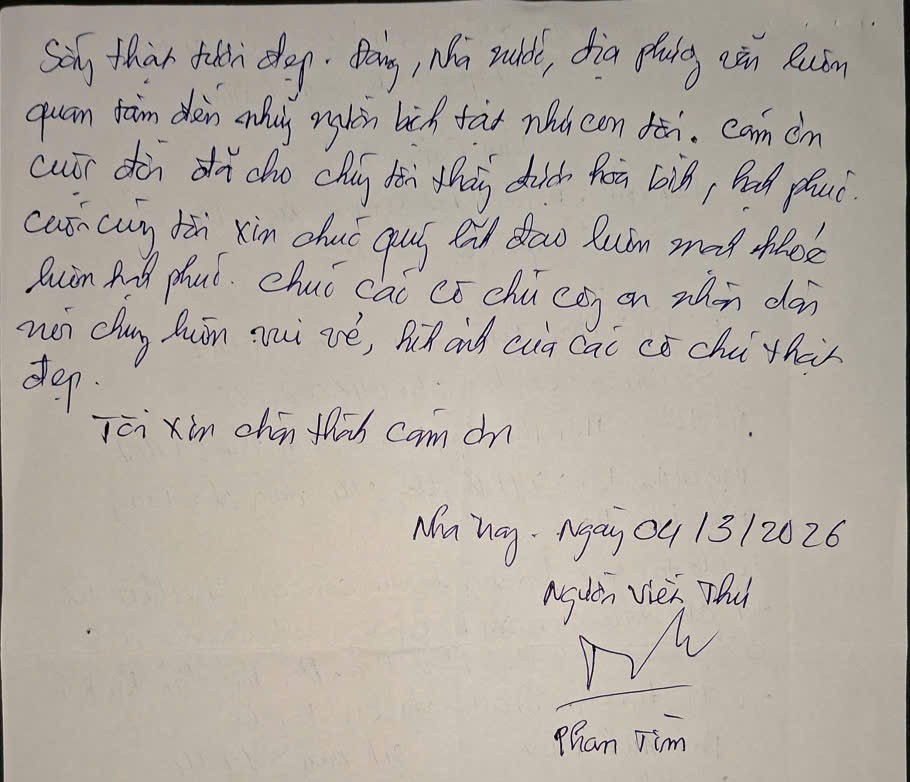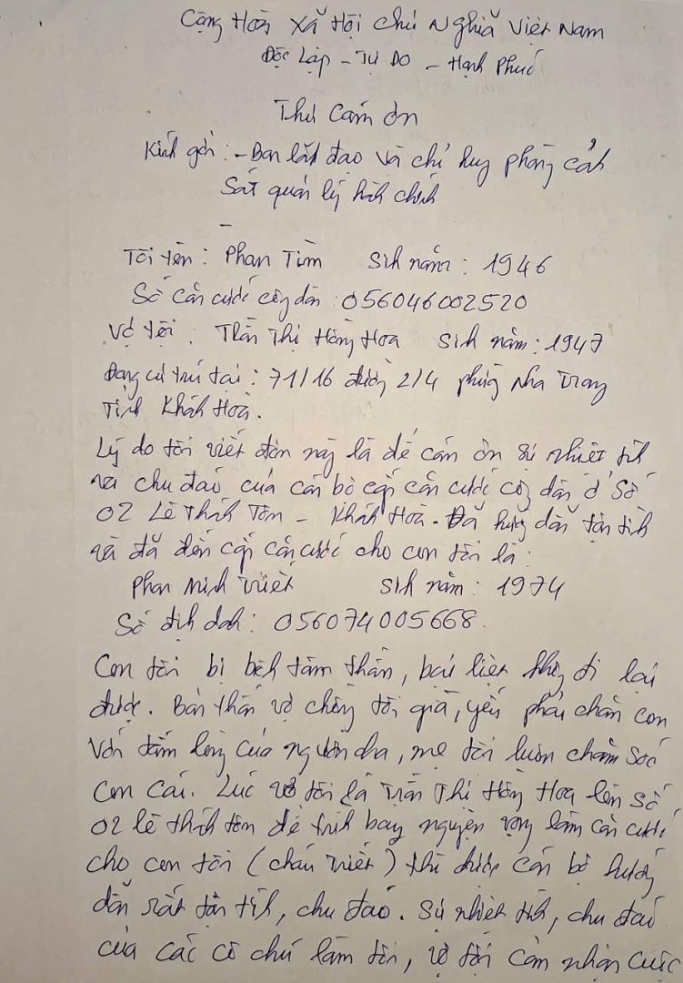 Chứng kiến sự tận tụy, trách nhiệm của cán bộ, chiến sĩ Phòng Cảnh sát Quản lý hành chính về trật tự xã hội, Công an tỉnh Khánh Hòa trong quá trình làm thủ tục cấp Căn cước cho người thân của mình, ông Phan Tìm (sinh năm 1946, trú tại 71/16 Đường 2/4, phường Nha Trang, tỉnh Khánh Hòa) đã viết thư bày tỏ sự cảm ơn sâu sắc đối với lực lượng Công an.