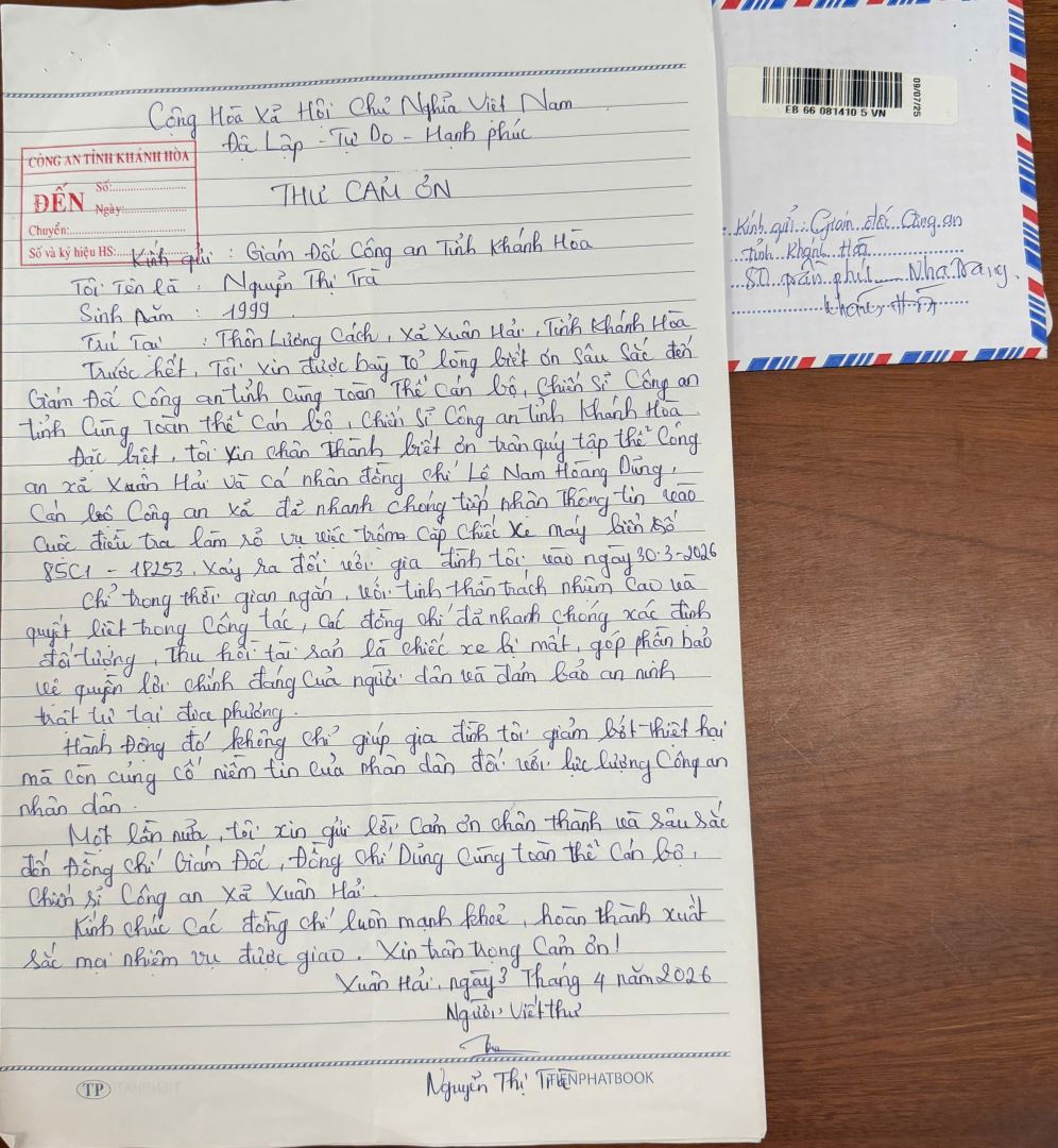 Công an cơ sở, chị Nguyễn Thị Trà đã viết thư cảm ơn gửi đến đơn vị. Trong thư, chị chia sẻ: “Hành động của các đồng chí không chỉ giúp gia đình tôi giảm bớt thiệt hại về tài sản mà còn củng cố niềm tin của nhân dân đối với lực lượng Công an nhân dân Việt Nam”.