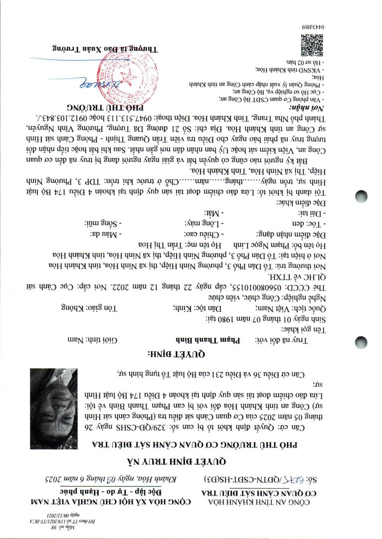 Phòng Cảnh sát hình sự – Công an tỉnh Khánh Hòa thông báo về đối tượng truy nã: Theo