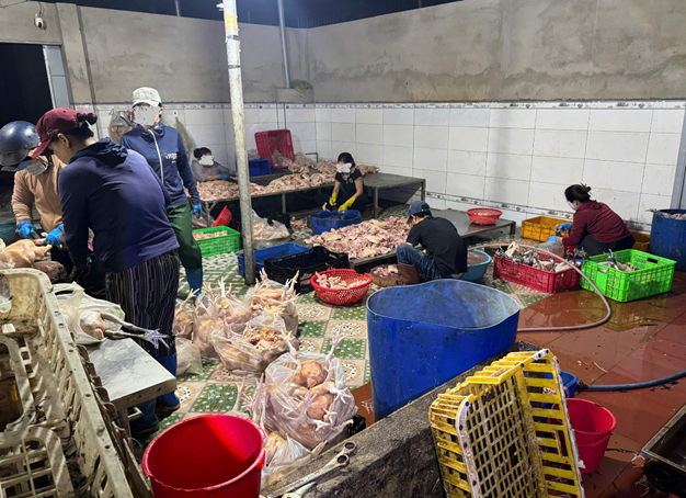 Tại thời điểm kiểm tra, cơ sở có 09 công nhân đang giết, mổ, sơ chế, phân mảnh và phân loại thịt gia cầm để bán ra thị trường. Qua kiểm tra, tổ công tác ghi nhận cơ sở có nhiều hành vi vi phạm và có dấu hiệu vi phạm pháp luật như: Không có bảng, biển, tiêu lệnh theo quy định; không có quy trình sản xuất, chế biến, giết mổ; chưa được cơ quan chức năng cấp Giấy chứng nhận cơ sở đủ điều kiện an toàn thực phẩm trong sản xuất, kinh doanh nông, lâm, thuỷ sản; người trực tiếp tiếp xúc với thực phẩm mà không mang đầy đủ bảo hộ lao động theo quy định; rác thải phát sinh sau quá trình sơ chế, chế biến được để lẫn lộn với thực phẩm đã sơ chế; nước thải phát sinh từ hoạt động sơ chế, giết mổ được xả trực tiếp ra môi trường; trong 02 kho đông lạnh bảo quản thực phẩm của cơ sở chứa khoảng 10 tấn gà nguyên con và thực phẩm từ gà đa số không có them, nhãn, không được đóng gói theo quy cách...