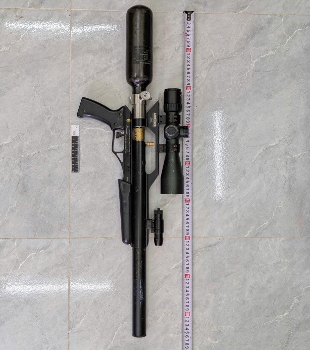 Cụ thể, khi đến khu vực Thôn 3, xã Hòa Trí, Tổ công tác phát hiện hai nam thanh niên đang có hành vi lắp ráp một đồ vật có hình dáng giống khẩu súng dài, màu đen, có gắn ống ngắm. Khi phát hiện lực lượng Công an, một đối tượng đã nhanh chóng lên xe máy (loại Sirius màu đen, chưa rõ biển kiểm soát) bỏ chạy khỏi hiện trường. Đối tượng còn lại được xác định là Ng.Đ.H. (trú tại thôn Phước Lâm, xã Tân Định, tỉnh Khánh Hòa) đã được mời về trụ sở Công an xã để làm việc.