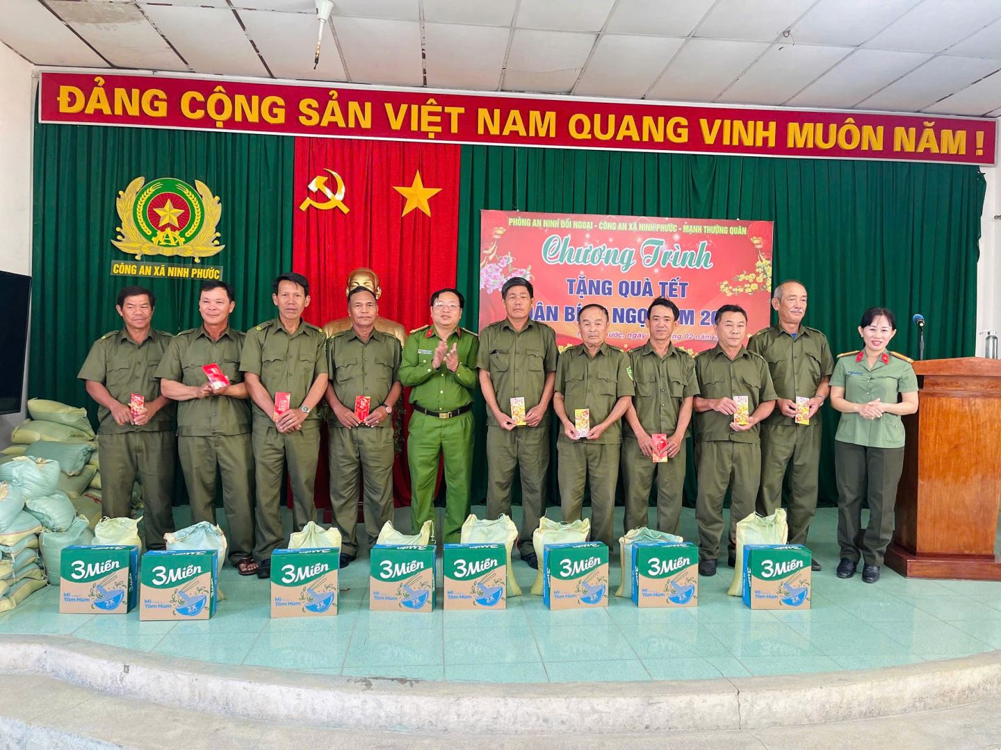Nhân dịp chuẩn bị đón Tết Nguyên đán Bính Ngọ năm 2026, ngày 12/02/2026, Phòng An ninh đối ngoại phối hợp Công an xã Ninh Phước tổ chức chương trình trao tặng quà Tết cho lực lượng tham gia bảo vệ an ninh, trật tự ở cơ sở (ANCS) có hoàn cảnh khó khăn trên địa bàn xã Ninh Phước. Tham dự chương trình có đồng chí Thượng tá Nguyễn Tiến Dũng - Phó Trưởng phòng Phòng An ninh đối ngoại; các đồng chí Ban Chỉ huy Công an xã Ninh Phước và mạnh thường quân.
