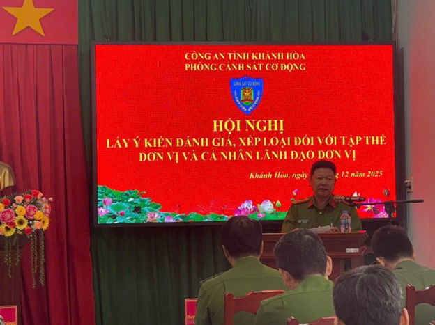 Này 03/12/2025, Phòng Cảnh sát cơ động Công an tỉnh Khánh Hòa tổ chức Hội nghị lấy ý kiến đánh giá, xếp loại đối với tập thể và cá nhân lãnh đạo đơn vị. Dự và chỉ đạo Hội nghị có đồng chí Đại tá Lê Quang Dũng - Phó Giám đốc Công an tỉnh, đại diện lãnh đạo Phòng Công tác chính trị; cùng toàn thể lãnh đạo, chỉ huy các đội nghiệp vụ và cán bộ chủ chốt của đơn vị.