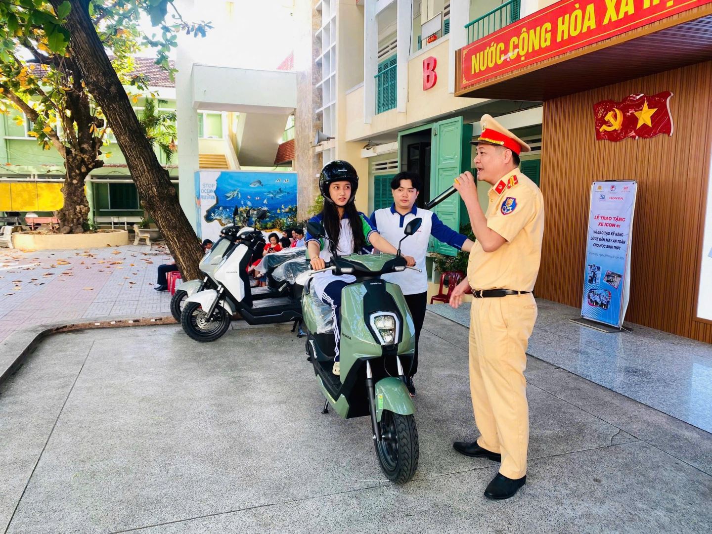 Tại chương trình, đại diện Công ty TNHH TM Huy Tân 3 đã trao tặng 06 chiếc xe máy điện cho nhà trường để phục vụ trong công tác giảng dạy cũng như hướng dẫn các em học sinh lái xe an toàn khi tham gia giao thông. Ngoài ra, cán bộ Phòng Cảnh sát giao thông đã tuyên truyền, phổ biến các quy định của pháp luật về trật tự an toàn giao thông đường bộ; hướng dẫn các tư thế ngồi trên xe máy điện an toàn khi tham gia giao thông. Đại diện Công ty TNHH TM Huy Tânhướng dẫn giới thiệu cách sử dụng và quy trình bảo hành của xe máy điện.