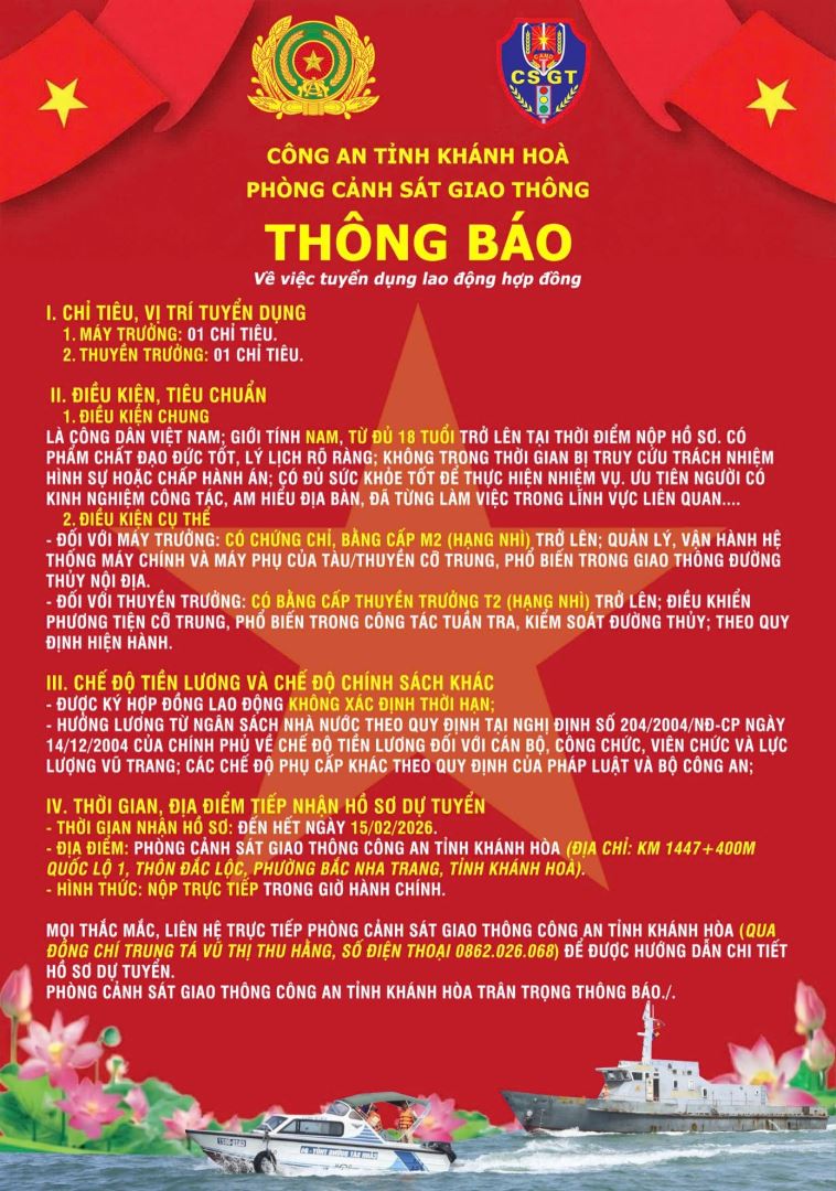 / Phòng Cảnh sát giao thông Công an tỉnh Khánh Hòa thông báo tuyển dụng lao động hợp đồng