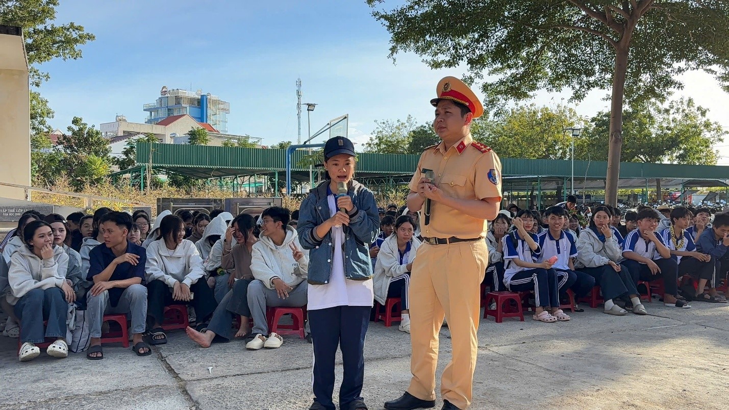 Buổi tuyên truyền được tổ chức sinh động, gần gũi thông qua các tình huống thực tế và phần giao lưu hỏi – đáp, giúp học sinh dễ tiếp thu, ghi nhớ và nâng cao kỹ năng tham gia giao thông an toàn