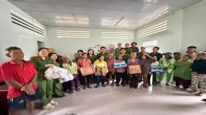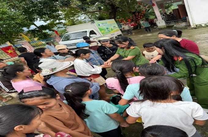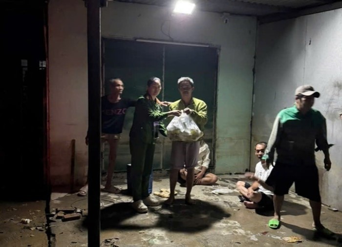 Sau khi trao nhu yếu phẩm, đoàn công tác của Phòng CSKT đã gửi lời thăm hỏi sâu sắc, sẻ chia những khó khăn và động viên người dân vùng lũ.
