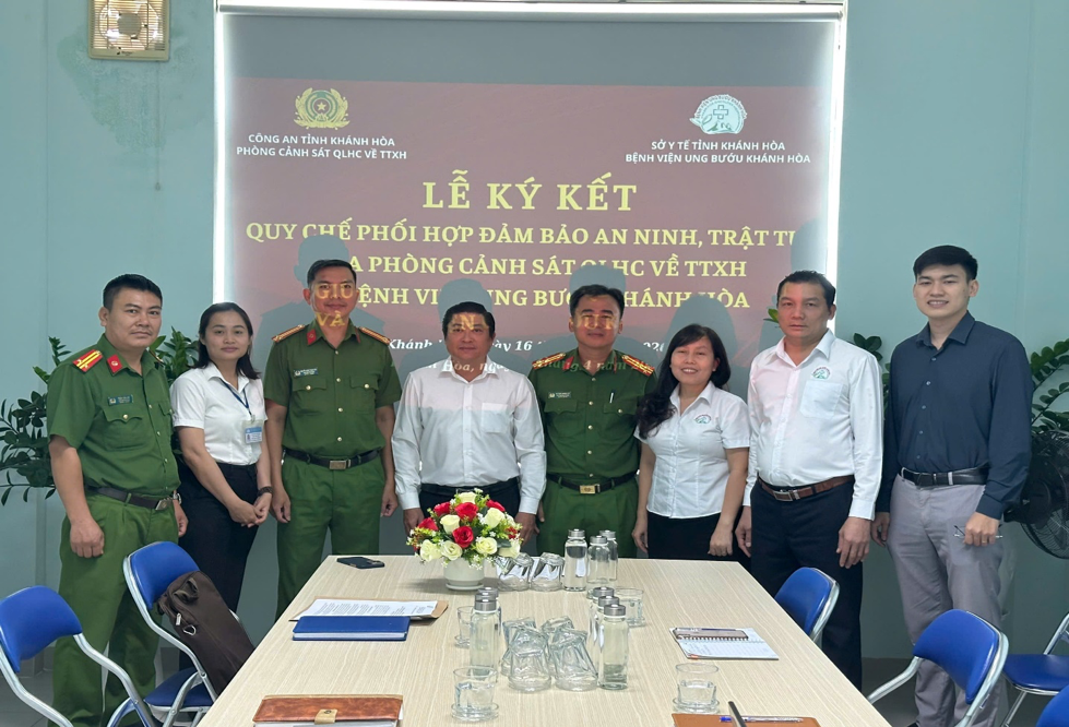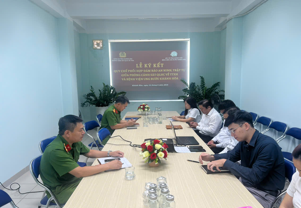 Chiều ngày 16/4/2026, Phòng Cảnh sát quản lý hành chính về trật tự xã hội và Bệnh viện Ung bướu Khánh Hòa tổ chức Lễ ký kết Kế hoạch phối hợp nhằm triển khai thực hiện Quy chế phối hợp số 7675/QCPH-CAT-SYT giữa Công an tỉnh Khánh Hòa và Sở Y tế tỉnh Khánh Hòa trong công tác bảo đảm an ninh, trật tự và lĩnh vực y tế trên địa bàn tỉnh Khánh Hòa. Tham dự buổi lễ có đồng chí Thượng tá Huỳnh Khánh Hà, phó trưởng phòng, cán bộ chiến sĩ Đội Cảnh sát trật tự, Phòng Cảnh sát quản lý hành chính về trật tự xã hội và Ban Giám đốc, cán bộ nhân viên các phòng, khoa chức năng của Bệnh viện Ung bướu Khánh Hòa.