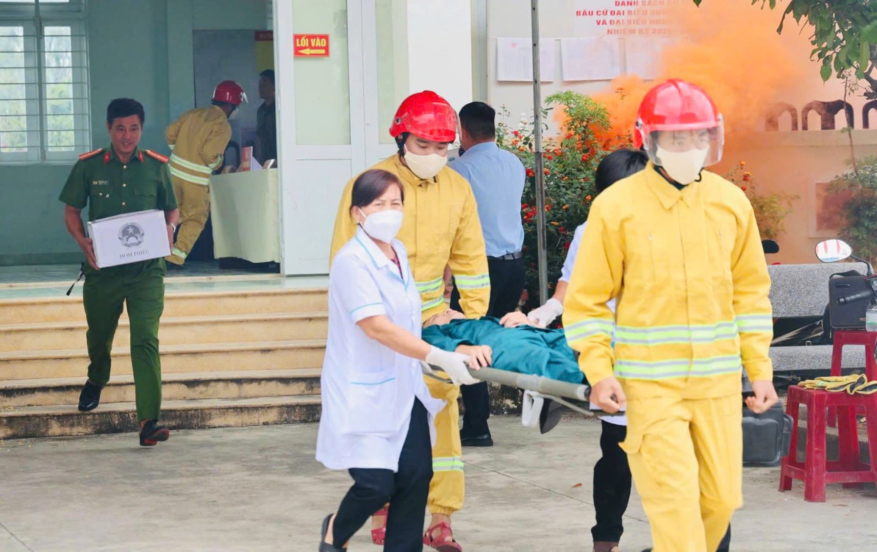 Buổi thực tập PCCC do Đội Chữa cháy và CNCH Khu vực 5, Công an tỉnh Khánh Hoà triển khai tại điểm bỏ phiếu số 11, TDP 16, phường Ninh Hoà.