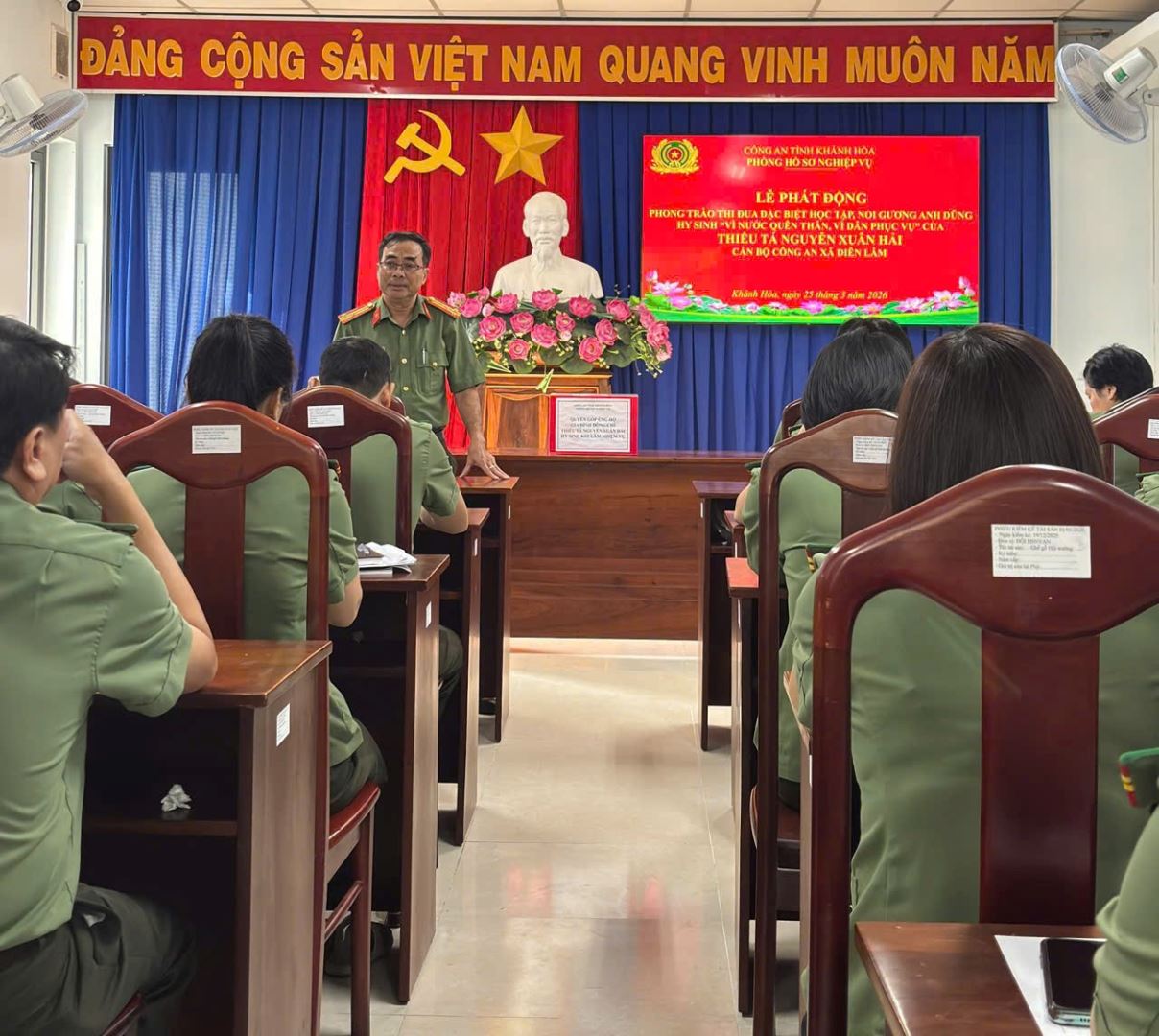 Vừa qua, Phòng Hồ sơ nghiệp vụ - Công an tỉnh Khánh Hòa đã tổ chức Lễ phát động phong trào thi đua đặc biệt học tập, noi gương anh dũng hy sinh của Thiếu tá Nguyễn Xuân Hải – Cán bộ Công an xã Diên Lâm, tỉnh Khánh Hoà. Buổi lễ do đồng chí Thượng tá Lê Văn Bảo, Trưởng phòng Hồ sơ nghiệp vụ chủ trì và phát động. Trong không khí trang nghiêm, tập thể cán bộ chiến sĩ (CBCS) đơn vị đã dành phút mặc niệm tưởng nhớ người đồng chí đã ngã xuống vì sự bình yên của Nhân dân.