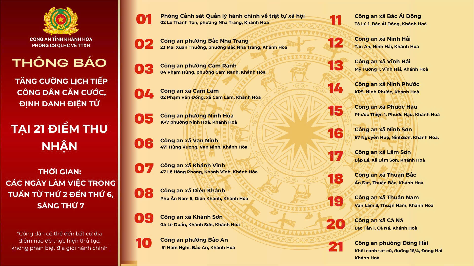 Phòng Cảnh sát quản lý hành chính về trật tự xã hội - Công an tỉnh Khánh Hòa tăng cường công tác thu nhận hồ sơ cấp Căn cước, Định danh điện tử cho công dân tại 21 điểm trên địa bàn tỉnh, cụ thể như sau: