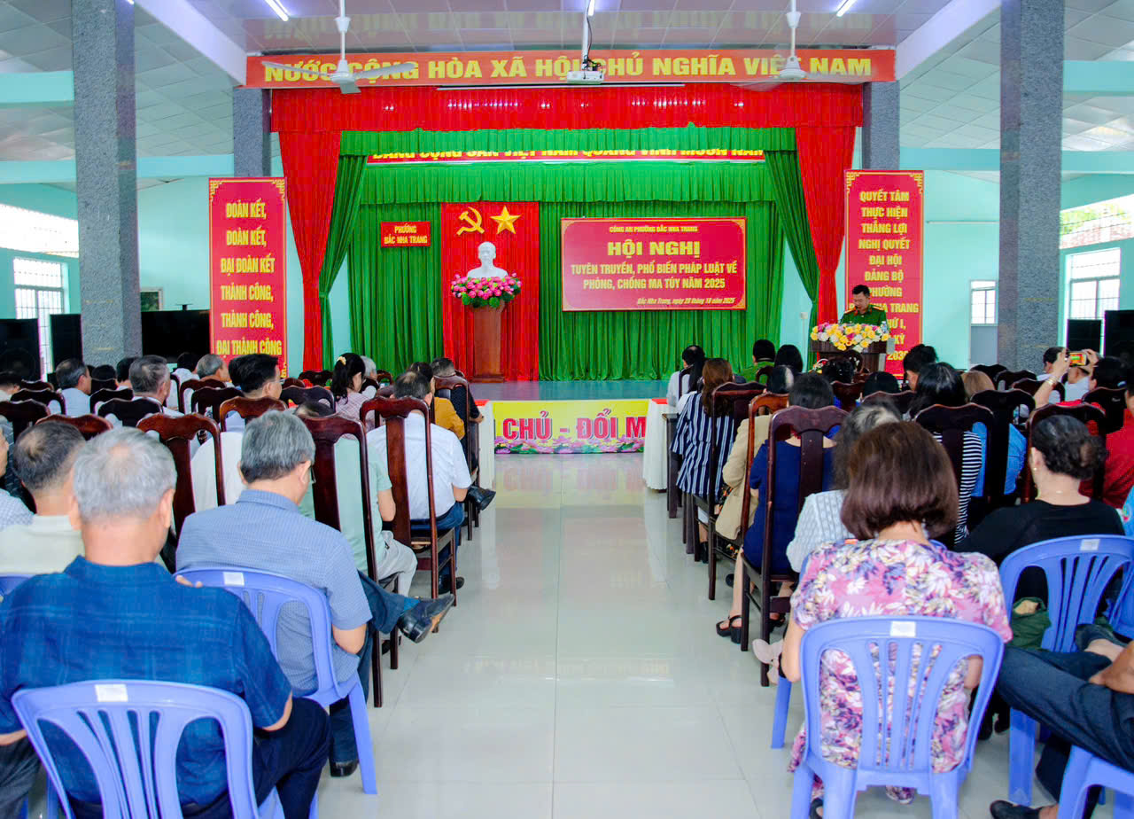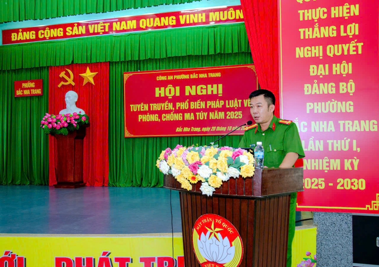 Ngày 20/10/2025, Phòng Cảnh sát điều tra tội phạm về ma túy, Công an tỉnh đã phối hợp với cấp ủy, chính quyền và Công an phường Bắc Nha Trang tổ chức tuyên truyền, phổ biến, giáo dục pháp luật về phòng chống ma túy cho các ban ngành, đoàn thể, đại diện Ban giám hiệu các Trường học, cán bộ và quần chúng nhân dân trên địa bàn.