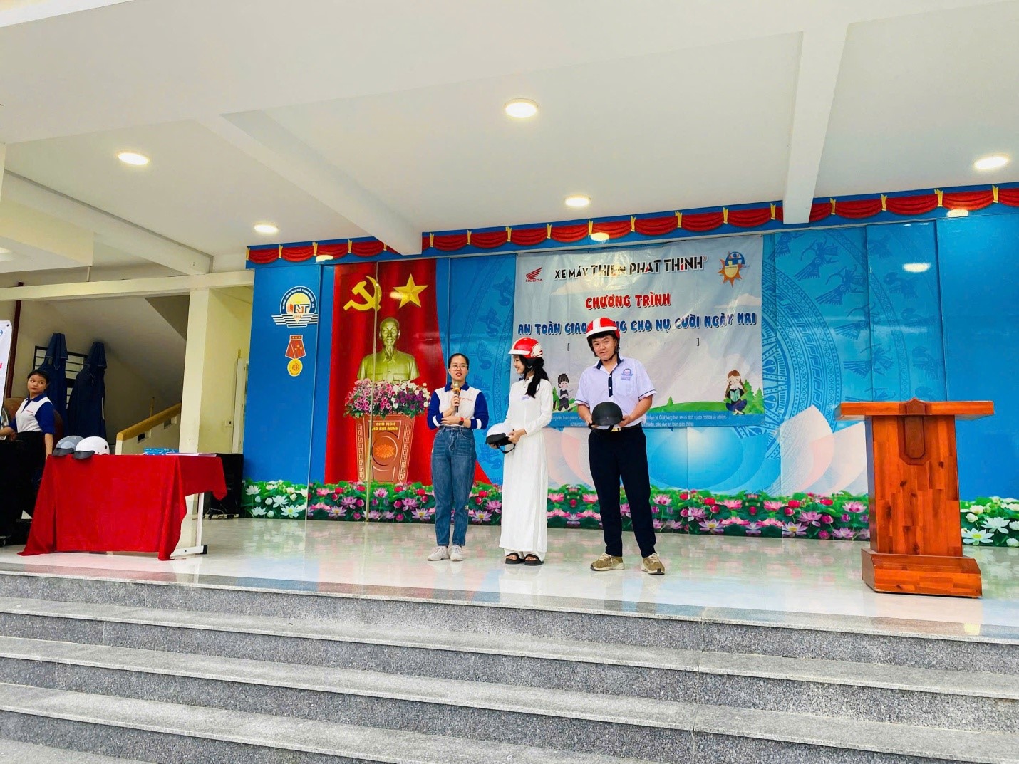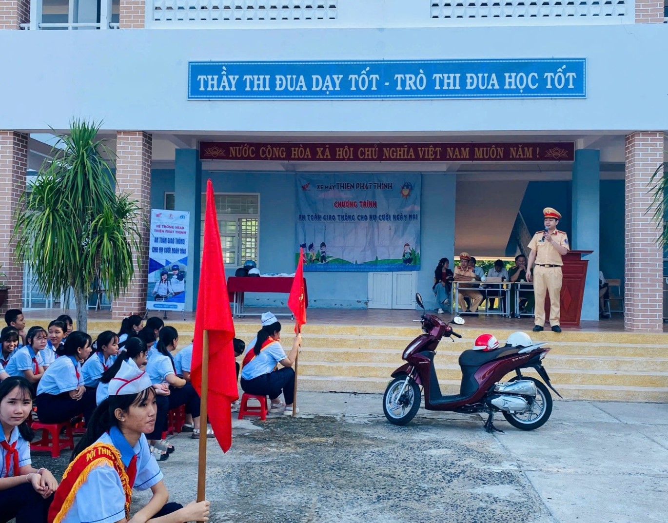 Đặc biệt, với sự phối hợp của cửa hàng xe máy Thiện Phát Thịnh, chương trình còn hướng dẫn kỹ năng lái xe an toàn, cách đội mũ bảo hiểm đúng quy chuẩn, giúp các em rèn luyện ý thức tự bảo vệ bản thân và bạn bè khi tham gia giao thông.