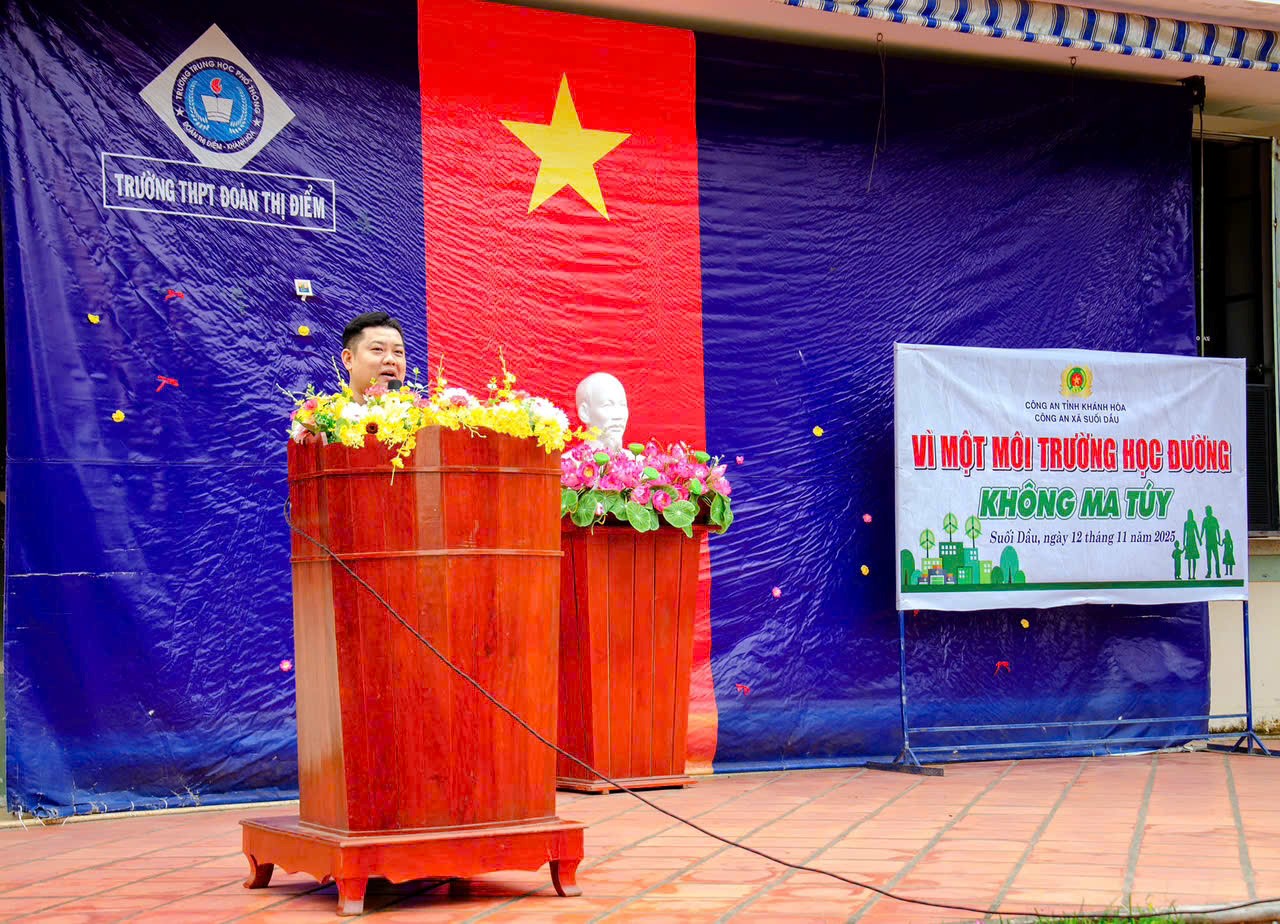Trước nguy cơ thuốc lá điện tử xâm nhập vào môi trường học đường, tiềm ẩn nhiều nguy cơ ảnh hưởng đến sức khỏe thậm chí ngộ độc do sử dụng sản phẩm này, ngày 12/11/2025, Phòng Cảnh sát điều tra tội phạm về ma túy - Công an tỉnh Khánh Hoà phối hợp cùng Công an Xã Suối Dầu tổ chức tuyên truyền về tác hại của thuốc lá điện tử, tác hại của ma túy và phòng chống tệ nạn ma túy học đường với sự tham gia của 30 thầy, cô giáo và trên 1000 học sinh của trường Trung học phổ thông Đoàn Thị Điểm.