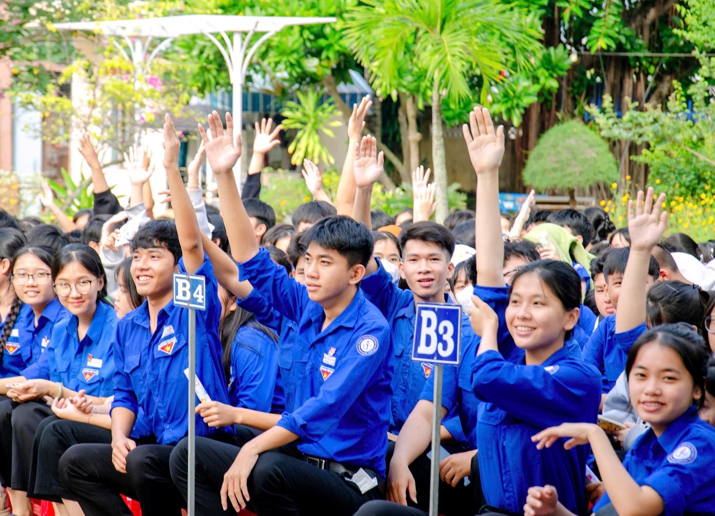 Học sinh nhà trường giơ tay phát biểu trả lời câu hỏi