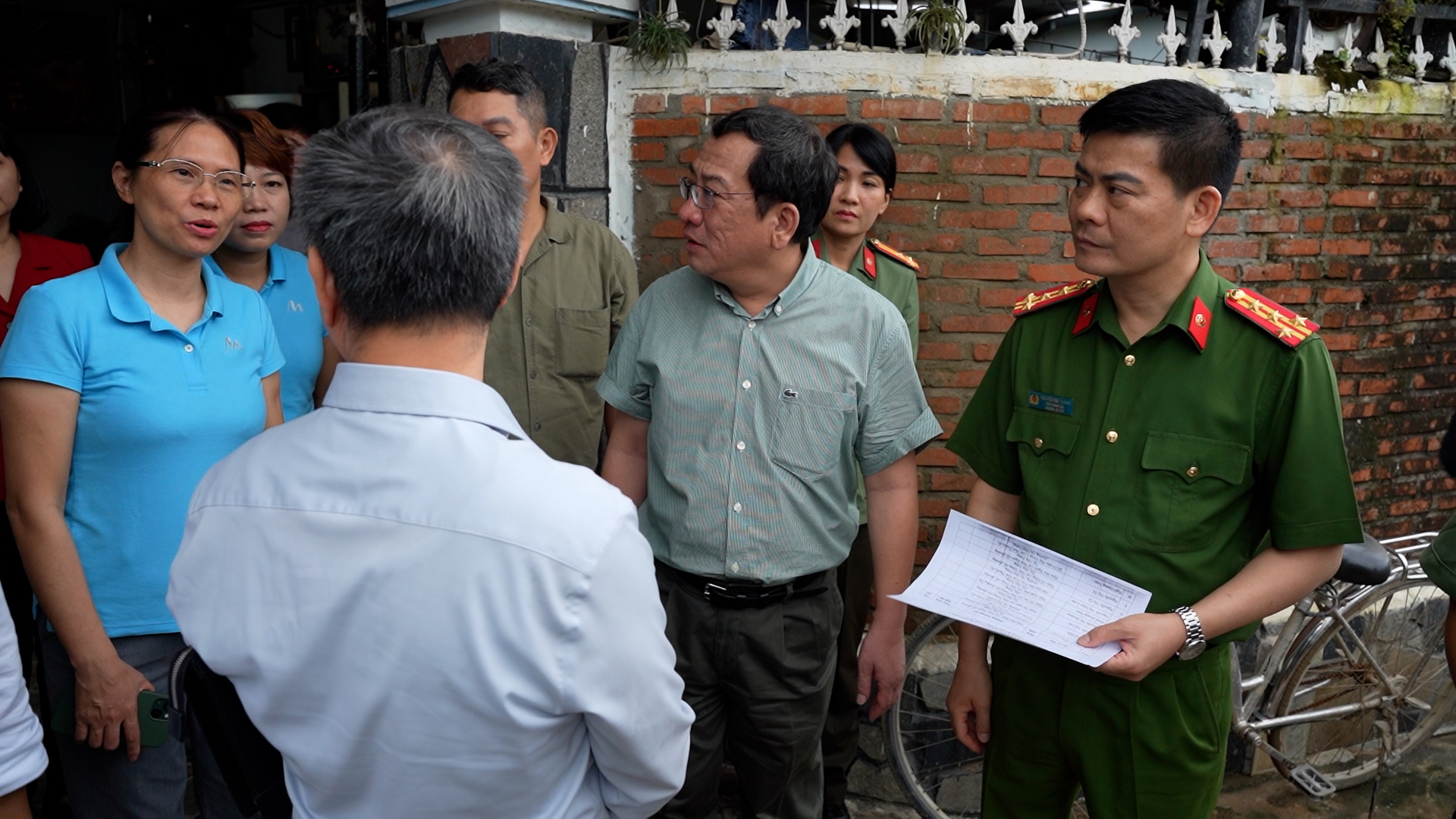 Thiếu tướng Đào Xuân Lân, Cục trưởng Cục Ngoại tuyến, Bộ Công an và Đại tá Nguyễn Bá Thành, Phó Giám đốc Công an tỉnh, các đơn vị mạnh thường quân thăm hỏi tình hình khắc phục lũ lụt của bà con nhân dân phường Tây Nha Trang.