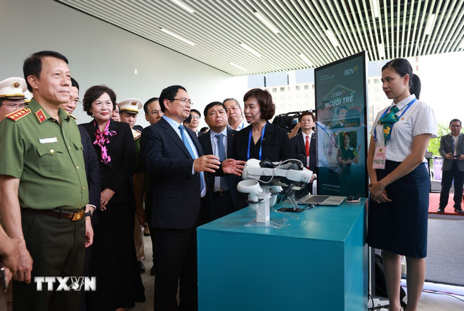 Thủ tướng Phạm Minh Chính tham quan gian hàng trưng bày sản phẩm công nghệ tại lễ khai trương Trung tâm Dữ liệu quốc gia. (Ảnh: Dương Giang/TTXVN)