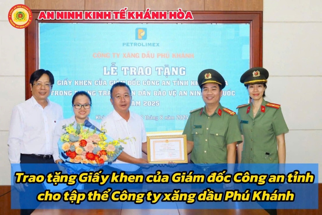 Phòng An ninh kinh tế trao tặng Giấy khen trong phong trào toàn dân bảo vệ an ninh Tổ quốc cho tập thể Công ty xăng dầu Phú Khánh