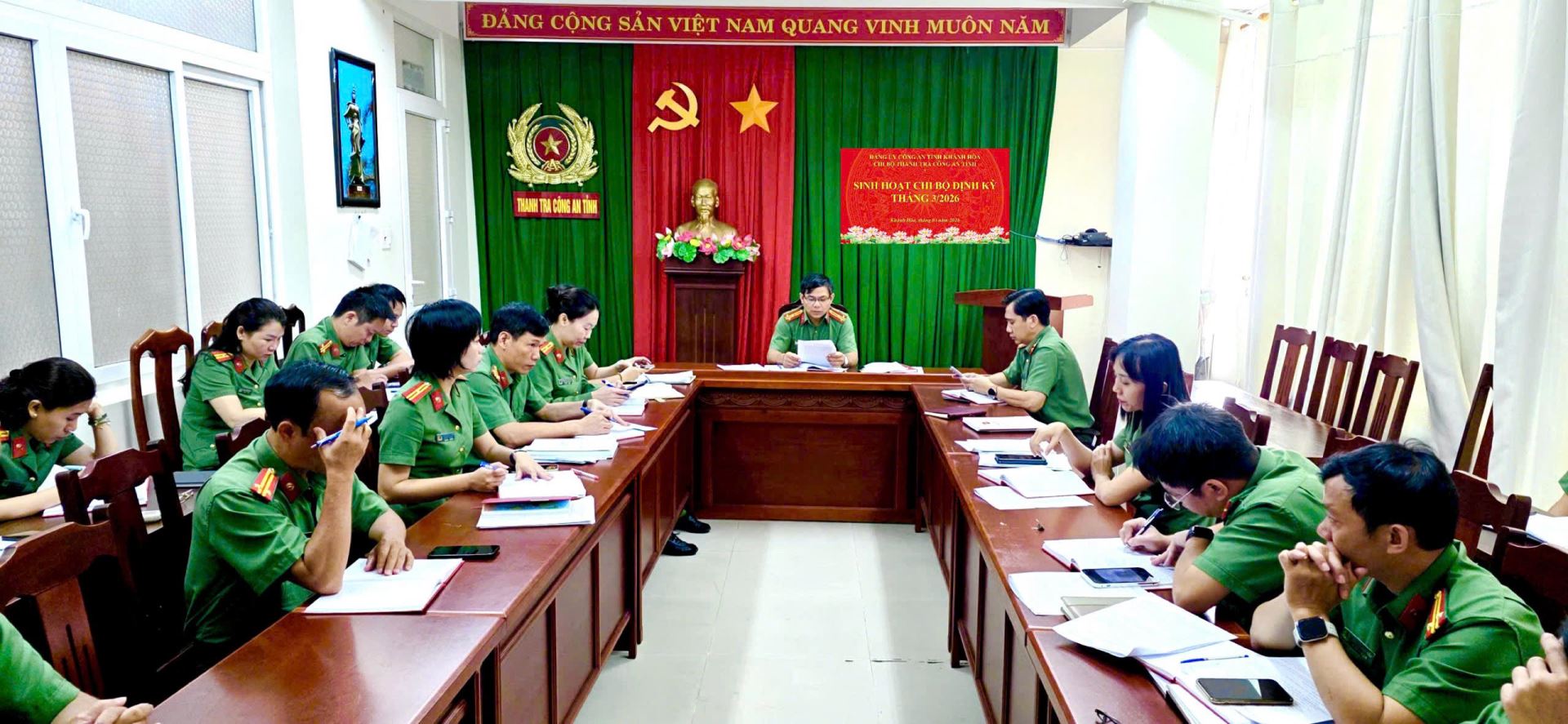 Ngày 03/03/2026, Chi bộ Thanh tra Công an tỉnh Khánh Hòa tổ chức sinh hoạt chính trị định kỳ tháng 03 năm 2026. Thực hiện chỉ đạo của Lãnh đạo Thanh tra Công an tỉnh về tăng cường công tác giáo dục chính trị tư tưởng trong tình hình mới, thời gian qua đơn vị đã triển khai đồng bộ nhiều nội dung, giải pháp thiết thực, đạt được những kết quả tích cực, góp phần nâng cao nhận thức chính trị, bản lĩnh và trách nhiệm của cán bộ chiến sĩ. Trọng tâm là đẩy mạnh công tác tuyên truyền về cuộc bầu cử Đại biểu Quốc hội Việt Nam Khóa XIV và bầu cử Đại biểu Hội đồng nhân dân các cấp nhiệm kỳ 2026 – 2031.