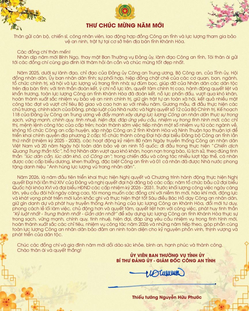 Thiếu tướng Nguyễn Hữu Phước - Ủy viên Ban Thường vụ Tỉnh ủy, Bí thư Đảng ủy, Giám đốc Công an tỉnh gửi Thư Chúc mừng năm mới cán bộ, chiến sĩ, công nhân viên, lao động hợp đồng Công an tỉnh và lực lượng tham gia bảo vệ an ninh, trật tự tại cơ sở trên địa bàn tỉnh Khánh Hòa.