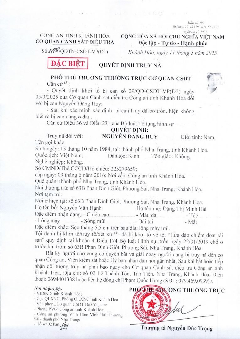Ai biết Nguyễn Đăng Huy ở đâu đều có quyền bắt giữ và áp giải ngay đến Cơ quan Công an, Viện kiểm sát, UBND nơi gần nhất, hoặc báo tin về Cơ quan cảnh sát điều tra Công an tỉnh Khánh Hòa, địa chỉ: số 02 – Lê Thánh Tôn, phường Nha Trang, tỉnh Khánh Hòa; số điện thoại: 0694.401.338 – 0794.690.939 liên hệ đồng chí Phạm Quốc Hưng./.