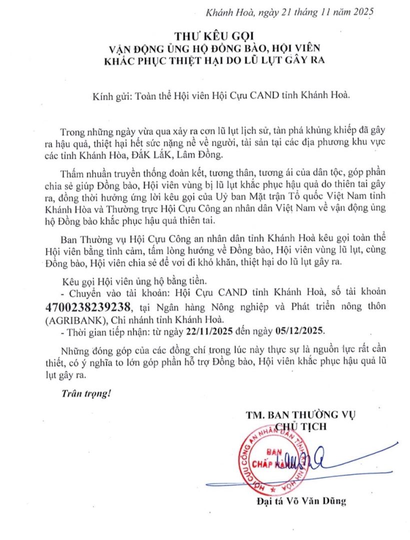 / Thư kêu gọi ủng hộ đồng bào và Hội viên bị thiệt hại do lũ lụt của Ban thường vụ Hội cựu CAND tỉnh