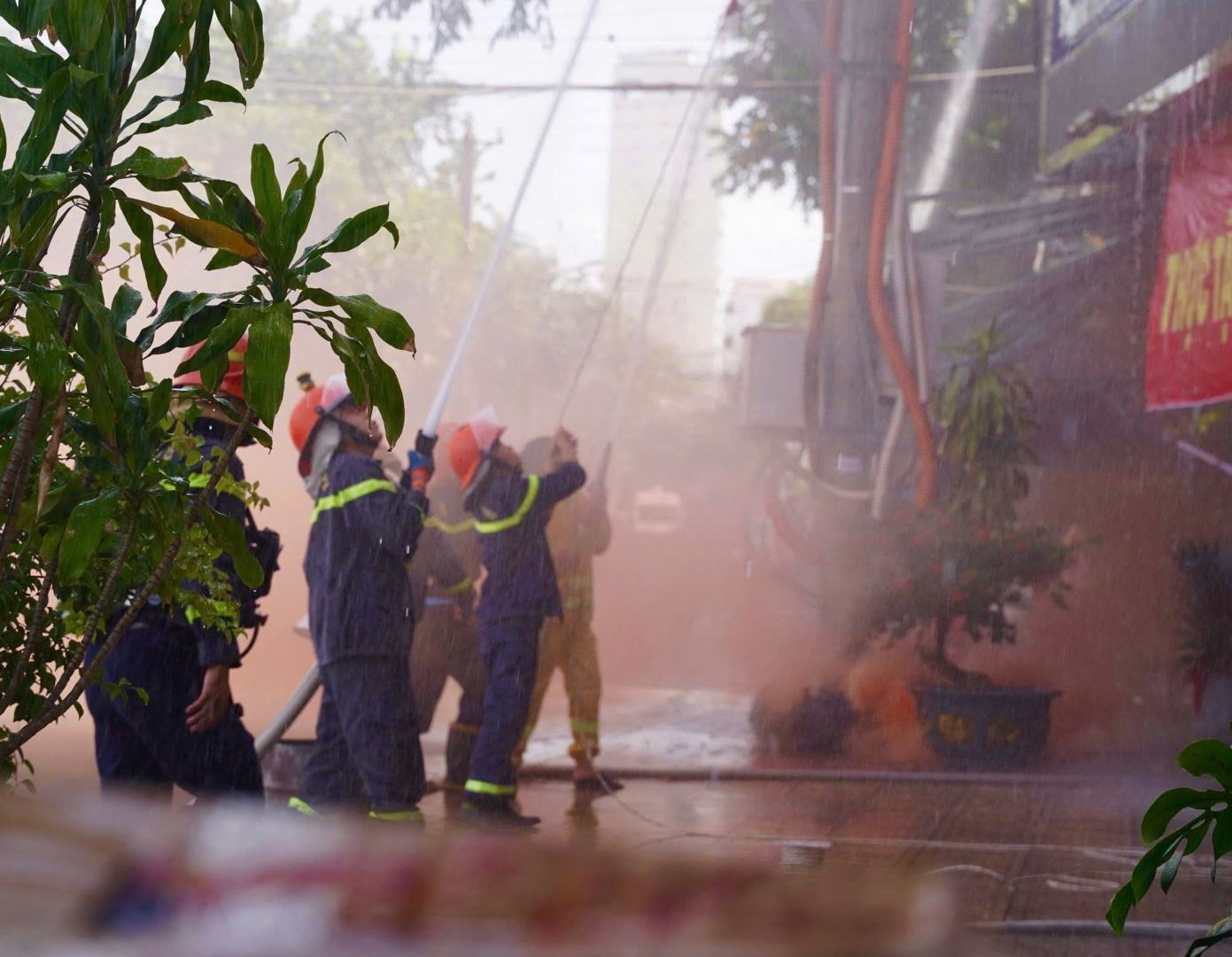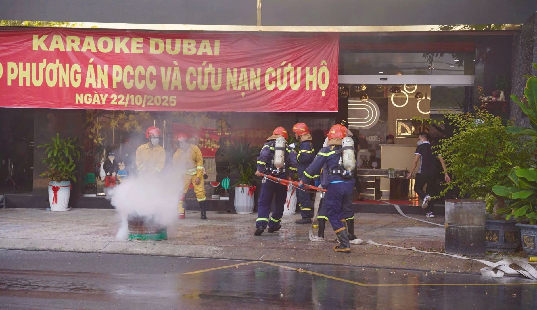 Tình huống giả định, do chập điện lửa bắt lên tại phòng Karaoke trên tầng 2, lửa bùng cháy nhanh khiến khách hoảng loạn, chen lấn, xô đẩy không thể thoát ra ngoài. Đám cháy nhanh chóng phát triển, tạo ra lượng lớn khói, khí độc phương tiện bảo hộ cá nhân còn nhiều hạn chế, lực lượng PCCC cơ sở không thể khống chế được đám cháy, khiến 04 người bị thương và nhiều người bị mắc kẹt tại các tầng. Khi lực lượng chữa cháy chuyên nghiệp đến hiện trường đã khẩn trương triển khai đội hình chữa cháy, cứu nạn, đồng thời phối hợp với lực lượng chữa cháy cơ sở nhanh chóng triển khai các biện pháp cứu người, chống cháy lan. Lực lượng chữa cháy chuyên nghiệp đã giải cứu các nạn nhân bị mắc kẹt, đưa ra ngoài an toàn. Sau thời gian khẩn trương dập lửa, đám cháy đã được dập tắt.