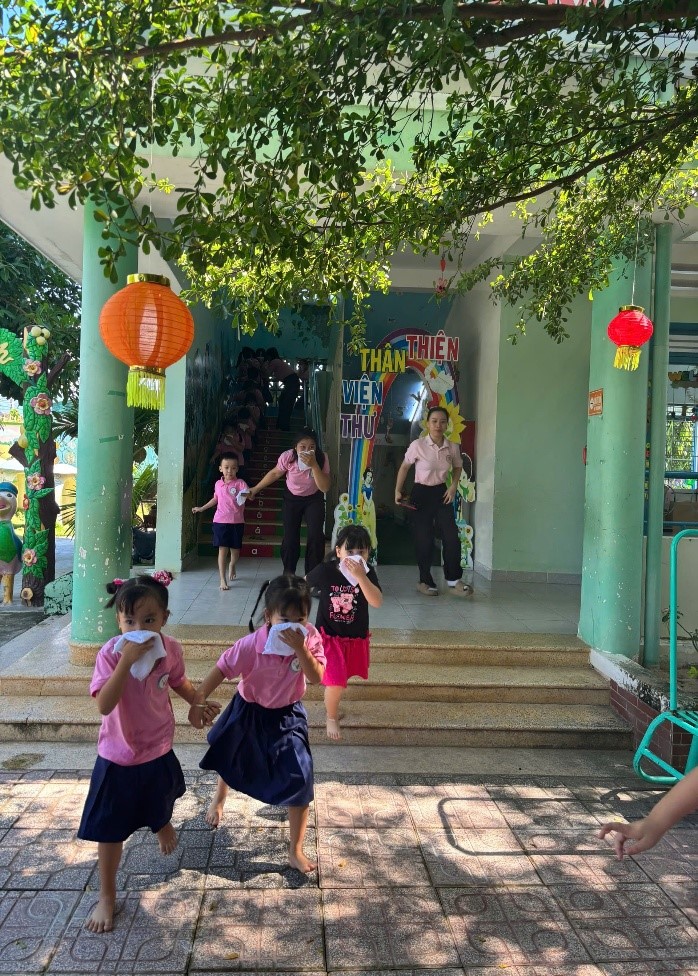 Giáo viên hướng dẫn các em học sinh thoát nạn