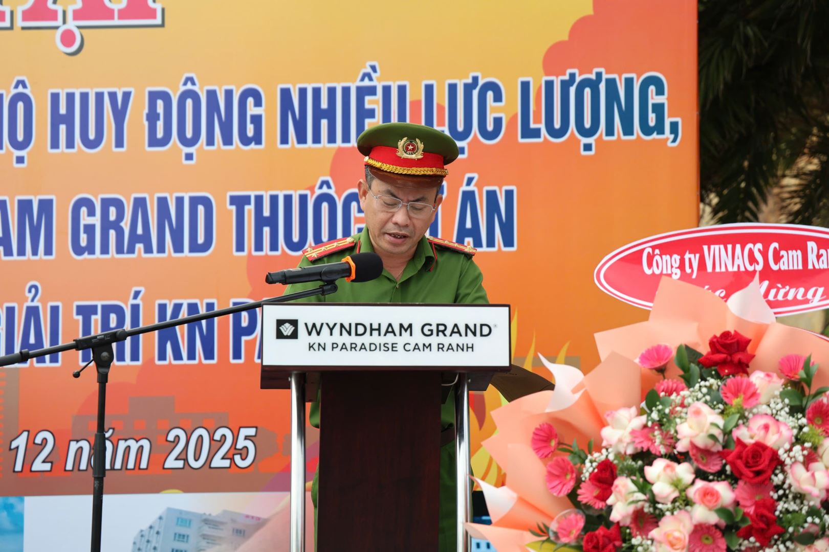 Sáng 23/12, Phòng Cảnh sát PCCC và CNCH Công an tỉnh Khánh Hòa phối hợp các lực lượng tổ chức thực tập phương án chữa cháy và cứu nạn, cứu hộ tại khu nghỉ dưỡng Wyndham Grand thuộc dự án Khu phức hợp nghỉ dưỡng và giải trí KN Paradise, phường Bắc Cam Ranh, tỉnh Khánh Hòa. Đại tá Lê Quang Đồng, Phó giám đốc Công an tỉnh tham dự.