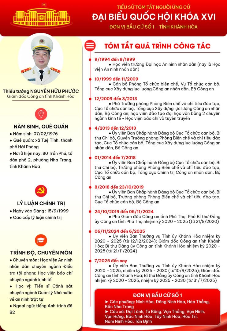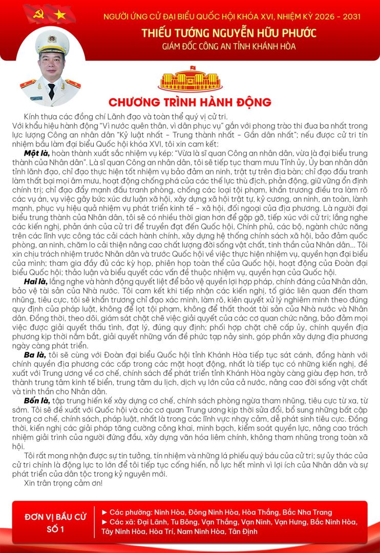 Công an tỉnh Khánh Hòa trân trọng thông tin về tiểu sử tóm tắt và chương trình hành động ứng cử viên đại biểu Quốc hội khóa XVI, nhiệm kỳ 2026 - 2031 của đồng chí Thiếu tướng Nguyễn Hữu Phước, Ủy viên Ban Thường vụ Tỉnh ủy, Bí thư Đảng ủy, Giám đốc Công an tỉnh Khánh Hòa.