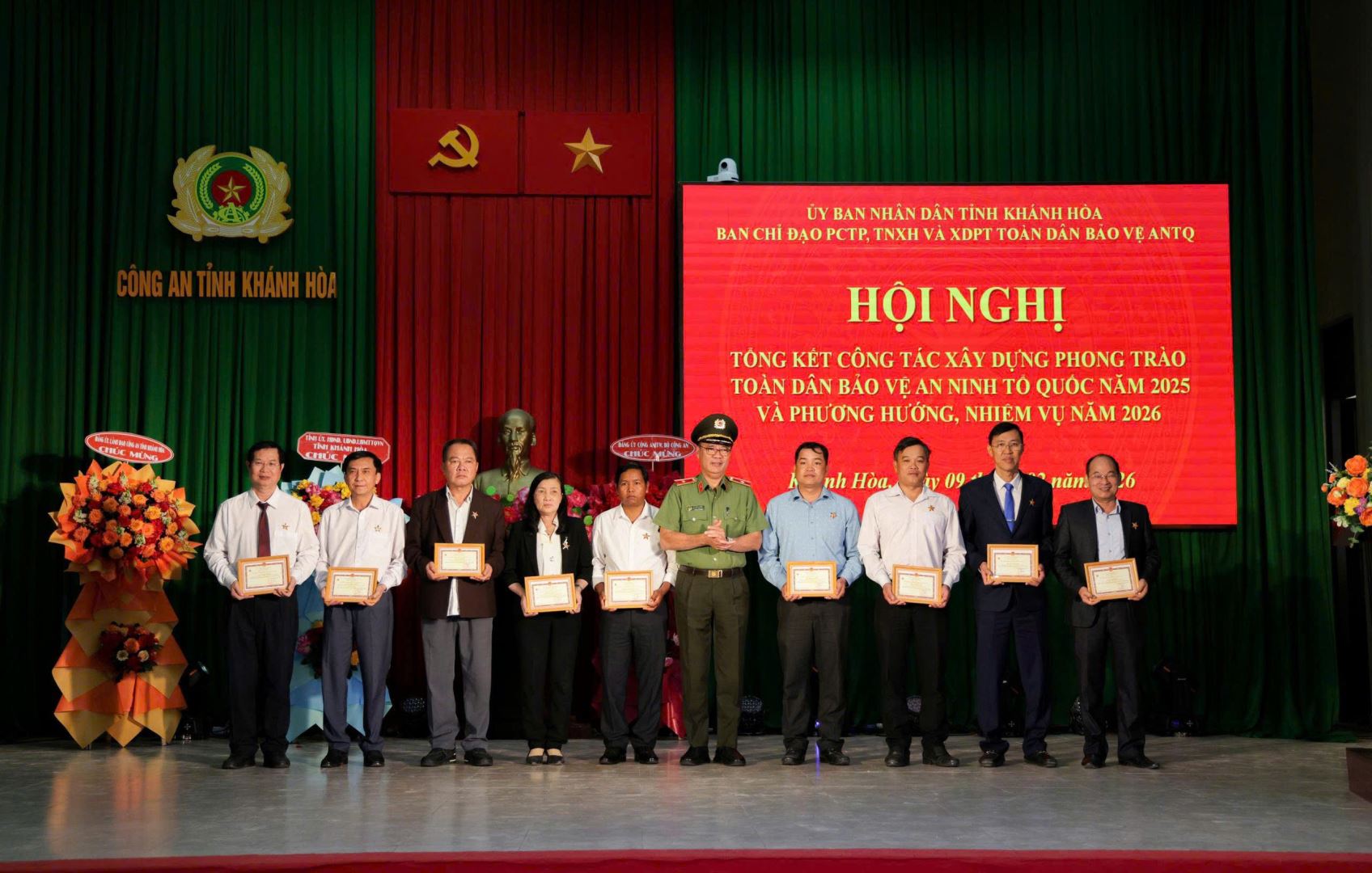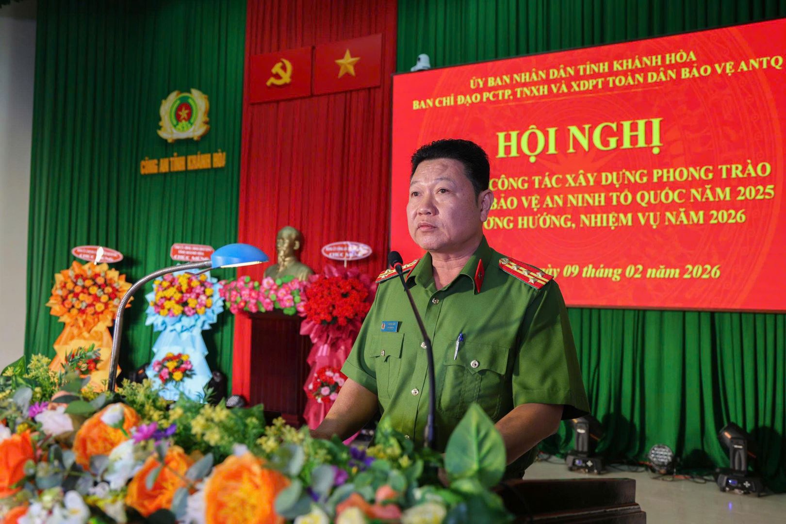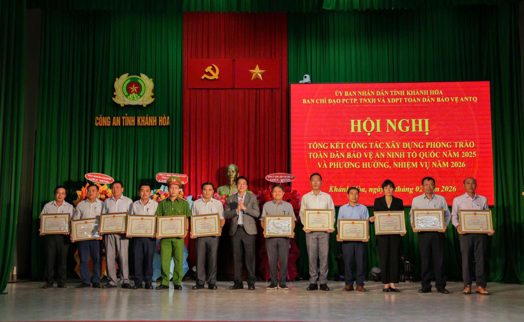Sáng ngày 09/2, tại Công an tỉnh Khánh Hoà, UBND tỉnh tổ chức Hội nghị tổng kết công tác xây dựng phong trào toàn dân bảo vệ An ninh Tổ Quốc (ANTQ) năm 2025 và triển khai nhiệm vụ công tác năm 2026. Dự Hội nghị, có các đồng chí: Nguyễn Long Biên, Uỷ viên Ban thường vụ tỉnh uỷ, Phó Chủ tịch thường trực UBND Tỉnh, Trưởng Ban chỉ đạo Phòng, chống tội phạm, tệ nạn xã hội và xây dựng phong trào toàn dân bảo vệ ANTQ tỉnh Khánh Hoà; Đồng chí Thiếu tướng Cao Đăng Hưng, Phó Chánh Văn phòng bộ Công an; Đồng chí Đại tá Lê Quang Dũng, Phó Giám đốc Công an tỉnh, Phó Trưởng Ban chỉ đạo Phòng, chống tội phạm, tệ nạn xã hội và xây dựng phong trào toàn dân bảo vệ ANTQ tỉnh Khánh Hoà. Đại diện lãnh đạo Cục xây dựng Phong trào Toàn dân bảo vệ ANTQ Bộ Công an và Lãnh đạo các sở, ngành địa phương trên địa bàn tỉnh.