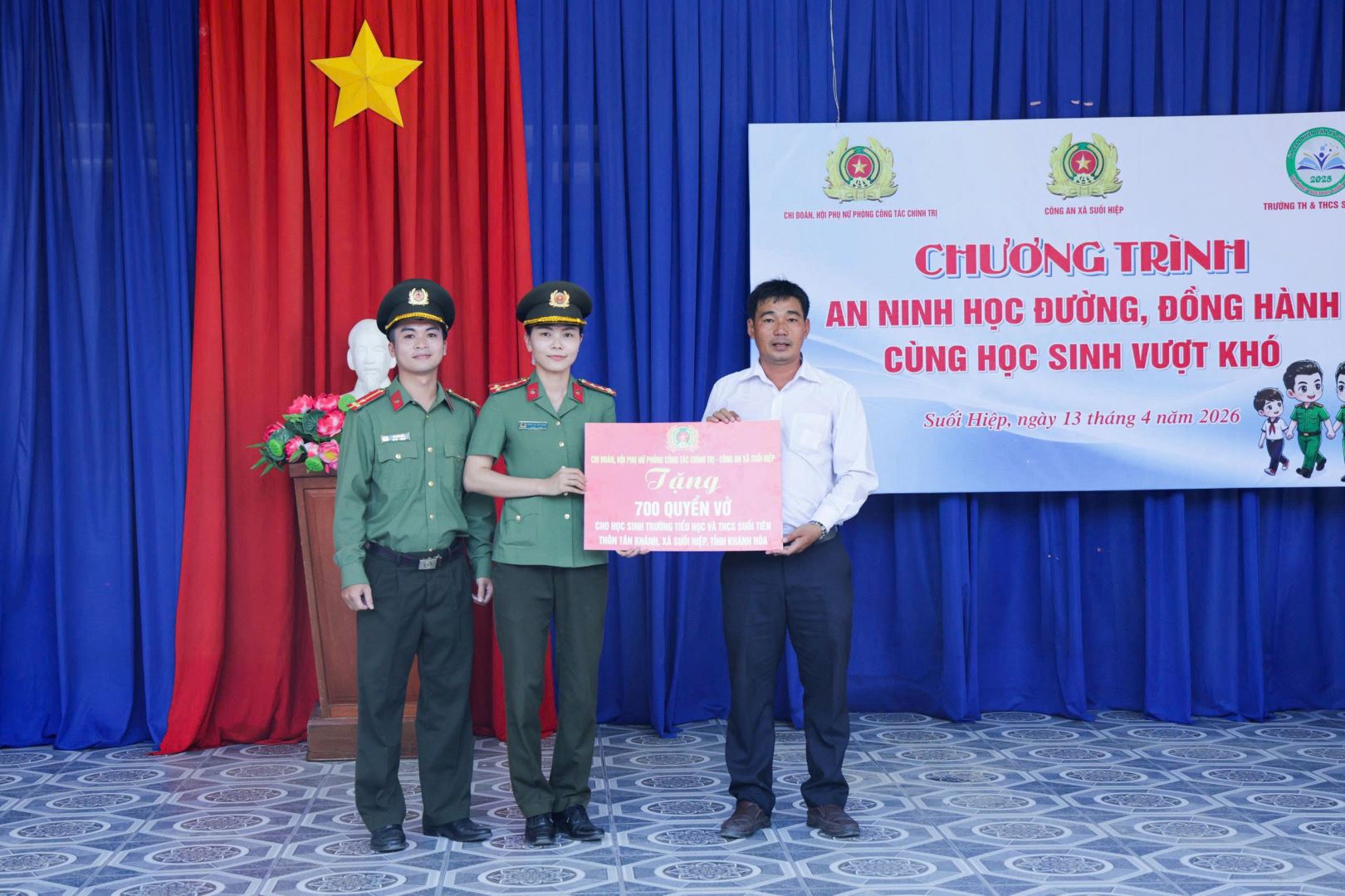 Phát huy tinh thần xung kích, tình nguyện, chung sức vì cộng đồng của Hội viên, Đoàn viên và CBCS Phòng Công tác chính trị; tích cực thực hiện các chỉ tiêu, nhiệm vụ, phần việc Chi đoàn và Hội phụ nữ đã đăng ký trong năm 2026. Chiều ngày 13/4, Đoàn thanh niên và Hội Phụ nữ Phòng Công tác chính trị Công an tỉnh Khánh Hoà phối hợp với Công an xã Suối Hiệp tổ chức chương trình “An ninh học đường - Đồng hành cùng học sinh vượt khó” tuyên truyền phổ biến pháp luật và trao tặng quà cho học sinh có hoàn cảnh khó khăn tại Trường Tiểu học và THCS Suối Tiên, xã Suối Hiệp.