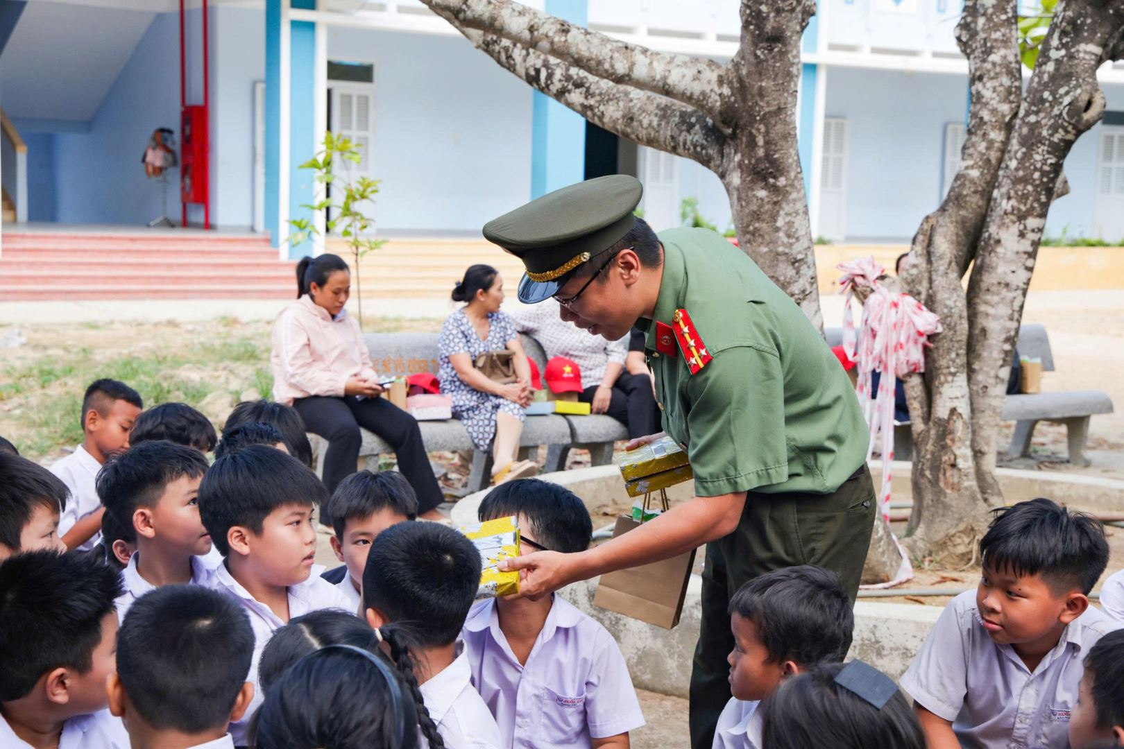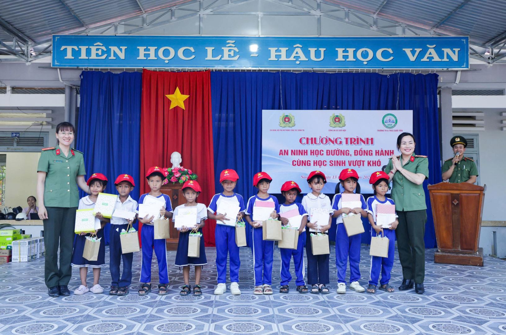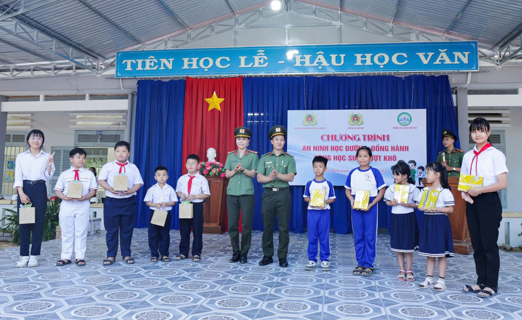 Chi đoàn, Hội phụ nữ Phòng Công tác chính trị phối hợp Công an xã Suối Hiệp trao tặng học bổng và các phần quà cho các em học sinh và Nhà trường