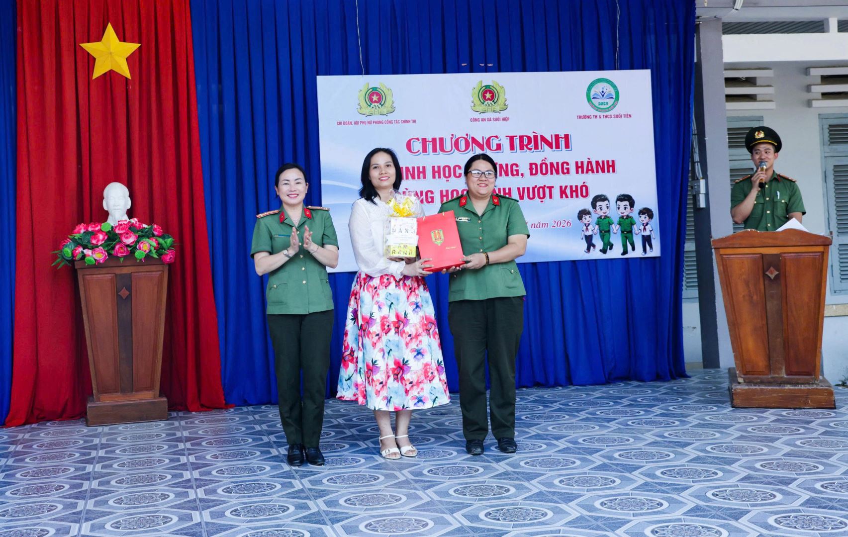 Chi đoàn, Hội phụ nữ Phòng Công tác chính trị phối hợp Công an xã Suối Hiệp trao tặng học bổng và các phần quà cho các em học sinh và Nhà trường.
