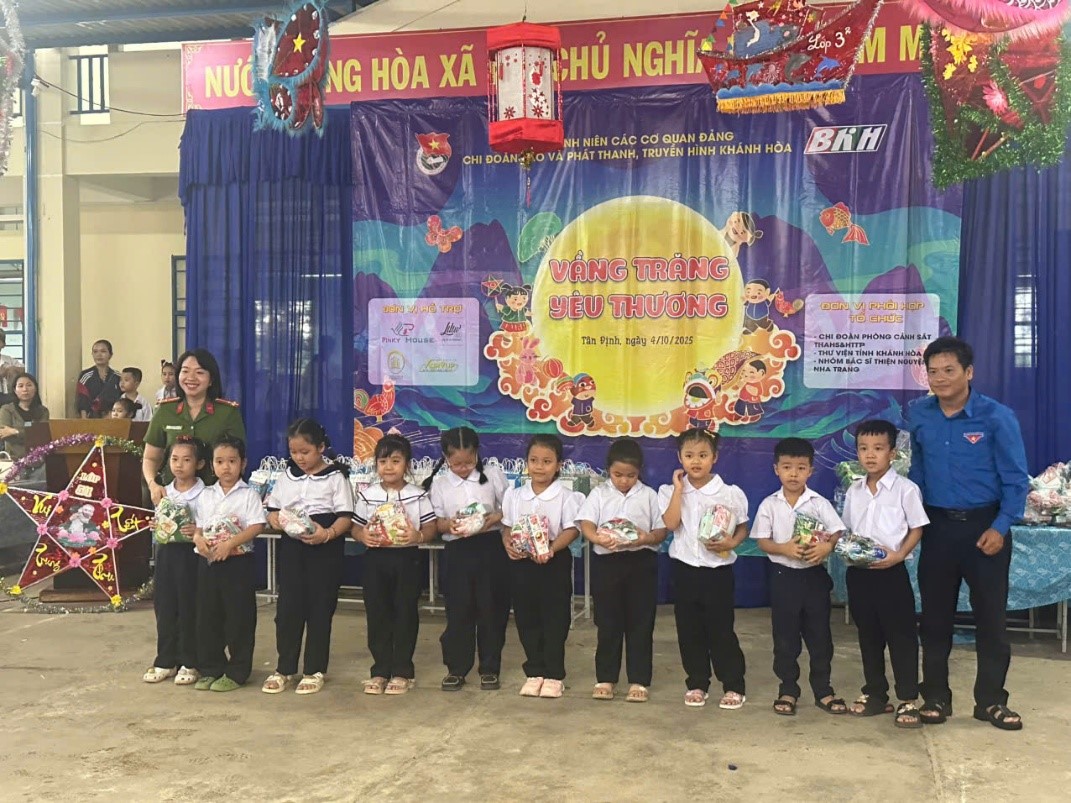 Chiều ngày 04-10, Chi đoàn Phòng Cảnh sát THAHS & HTTP Công an tỉnh Khánh Hòa và Chi đoàn Báo & PTTH Khánh Hòa phối hợp cùng các đơn vị tài trợ và mạnh thường quân tổ chức chương trình “Vầng trăng yêu thương” đã mang đến Tết Trung thu nhộn nhịp đến với học sinh Trường Tiểu học Ninh Bình (xã Tân Định, tỉnh Khánh Hòa).