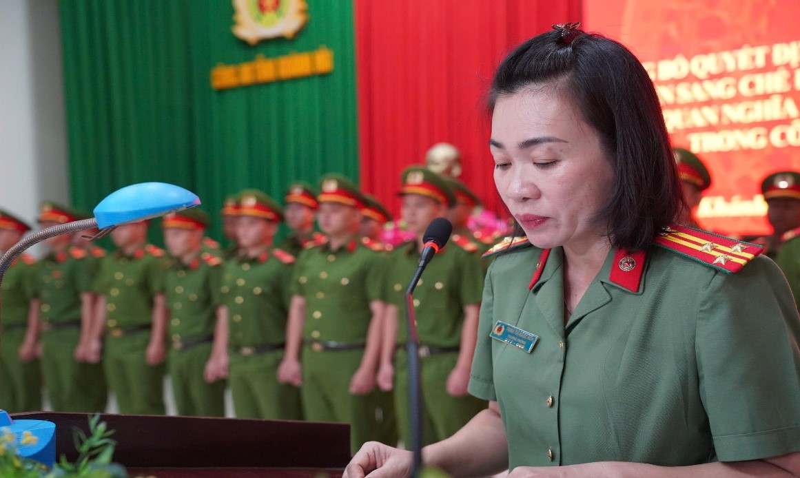 Thượng tá Trịnh Thị Ngọc Hoa, Bí thư Đảng ủy, Trưởng phòng Phòng Tổ chức cán bộ Công bố Quyết định chuyển sang chế độ phục vụ chuyên nghiệp đối với hạ sĩ quan nghĩa vụ hết thời hạn phục vụ tại ngũ trong CAND.
