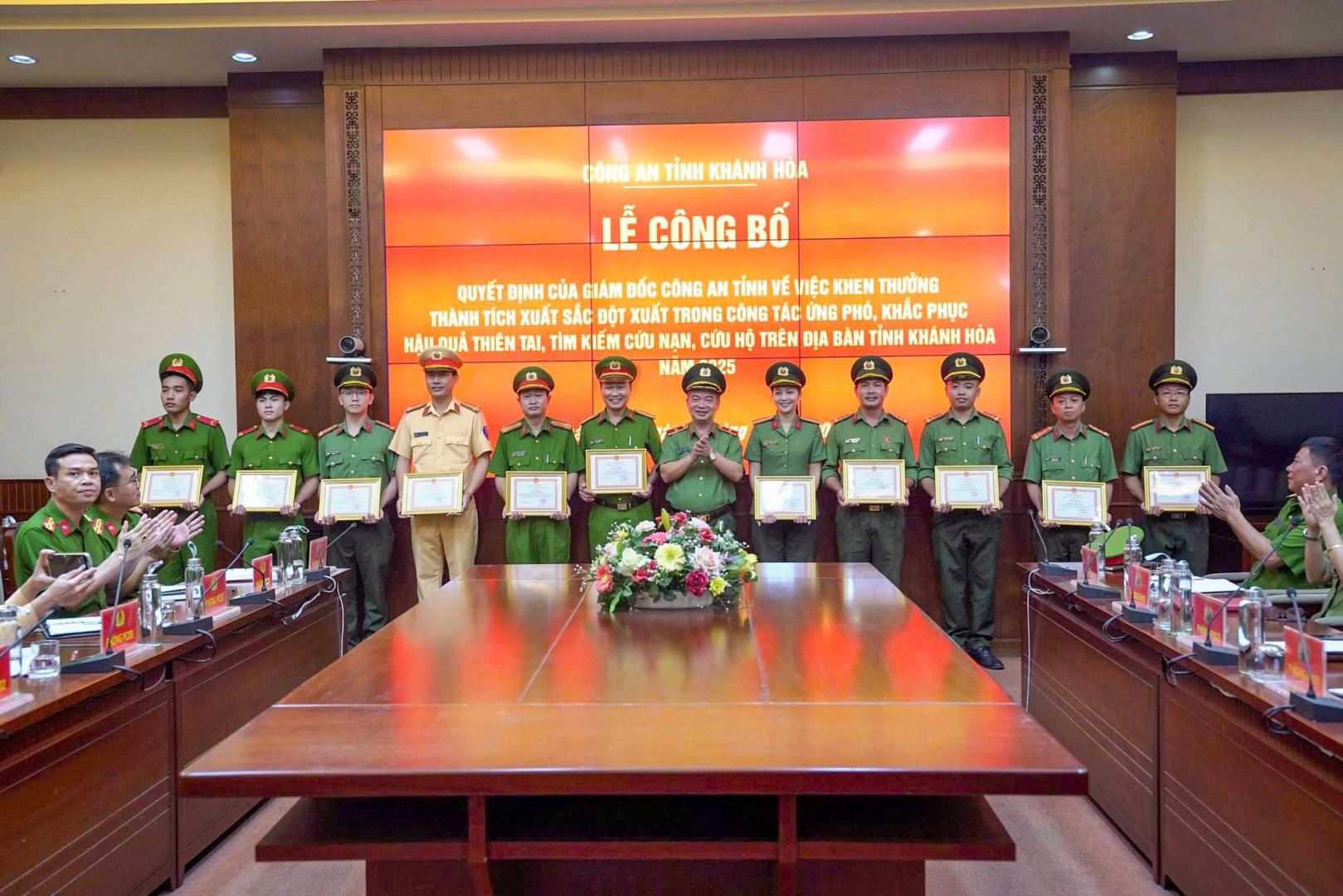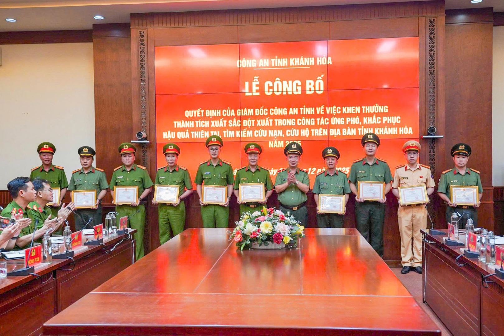 Giám đốc Công an tỉnh Khánh Hòa đã tặng giấy khen cho các tập thể và cá nhân có thành tích xuất sắc đột xuất trong công tác ứng phó, khắc phục hậu quả thiên tai, tìm kiếm cứu nạn, cứu hộ trên địa bàn tỉnh Khánh Hòa năm 2025.