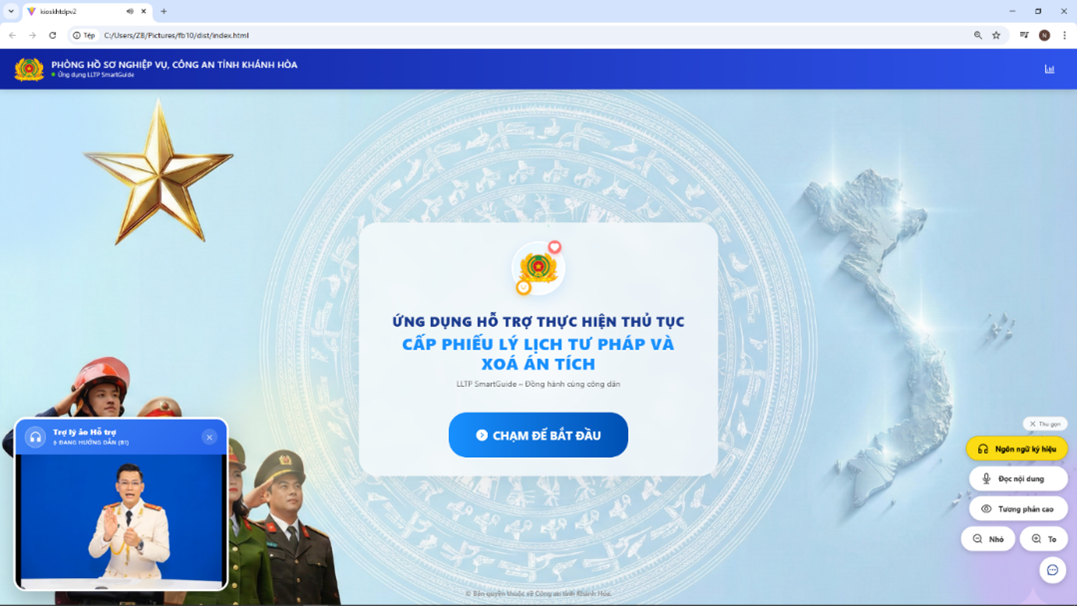 Sáng kiến tập trung vào việc ứng dụng công nghệ thông tin để hỗ trợ công dân trong quá trình thực hiện thủ tục cấp Phiếu lý lịch tư pháp và xóa án tích. Nội dung sáng kiến đề xuất xây dựng hệ thống hướng dẫn thông minh có khả năng cung cấp thông tin, quy trình thực hiện thủ tục một cách trực quan, dễ hiểu, hỗ trợ nhiều ngôn ngữ khác nhau và tích hợp ngôn ngữ ký hiệu nhằm tạo điều kiện thuận lợi cho người dân - đặc biệt là người nước ngoài, người khiếm thính và người đã từng có án tích - có thể dễ dàng tiếp cận thông tin và thực hiện thủ tục hành chính một cách thuận lợi, minh bạch, nhanh chóng, giảm bớt khó khăn trong việc chuẩn bị hồ sơ và hạn chế sai sót trong quá trình thực hiện thủ tục. Không chỉ dừng lại ở việc nghiên cứu lý thuyết, đồng chí còn trực tiếp thử nghiệm, hoàn thiện nội dung hướng dẫn, đảm bảo tính chính xác, dễ hiểu và thân thiện với người sử dụng.