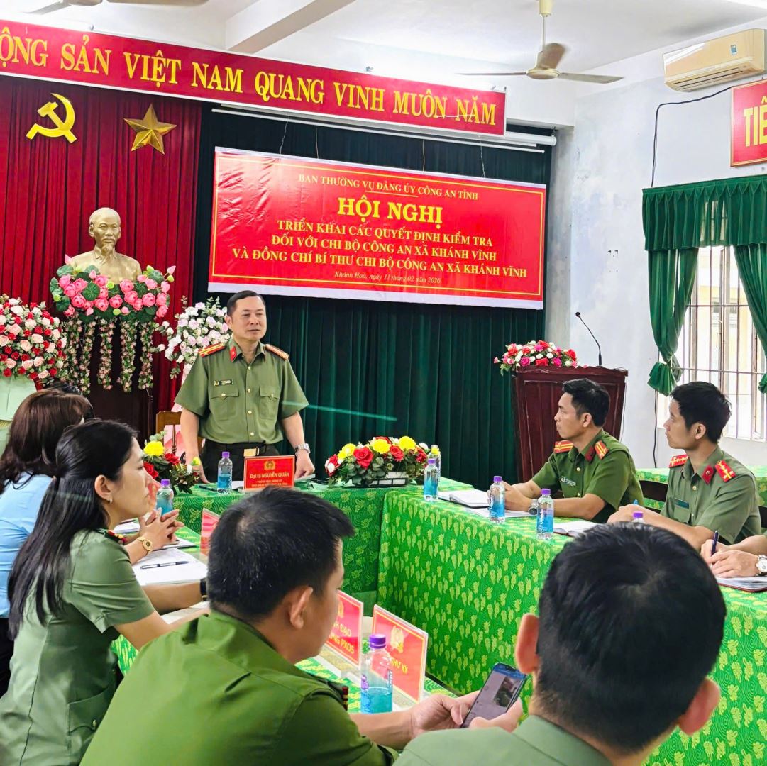 Ngày 11/02, Ban Thường vụ Đảng uỷ Công an tỉnh tổ chức Hội nghị triển khai Quyết định kiểm tra đối với Cấp uỷ Chi bộ và cá nhân đồng chí Bí thư Chi bộ, Trưởng Công an xã Khánh Vĩnh. Đồng chí Đại tá Nguyễn Quân - Phó Bí thư Đảng uỷ, Chủ nhiệm UBKT Đảng uỷ, Phó Giám đốc Công an tỉnh - Trưởng Đoàn kiểm tra chủ trì Hội nghị.