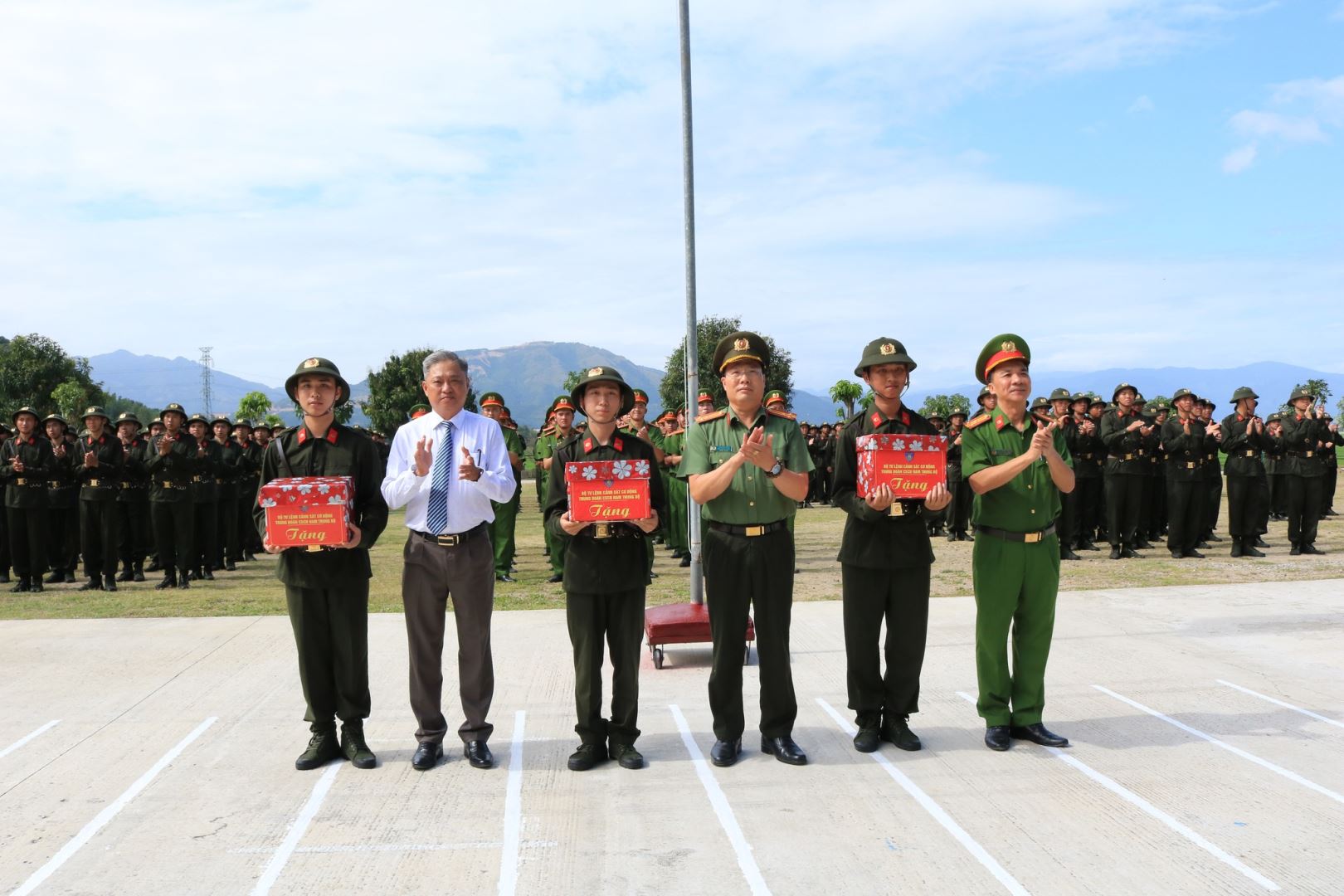 Đại diện Trung đoàn Cảnh sát Cơ động, Công an tỉnh và phường Tây Nha Trang tặng quà các tân binh